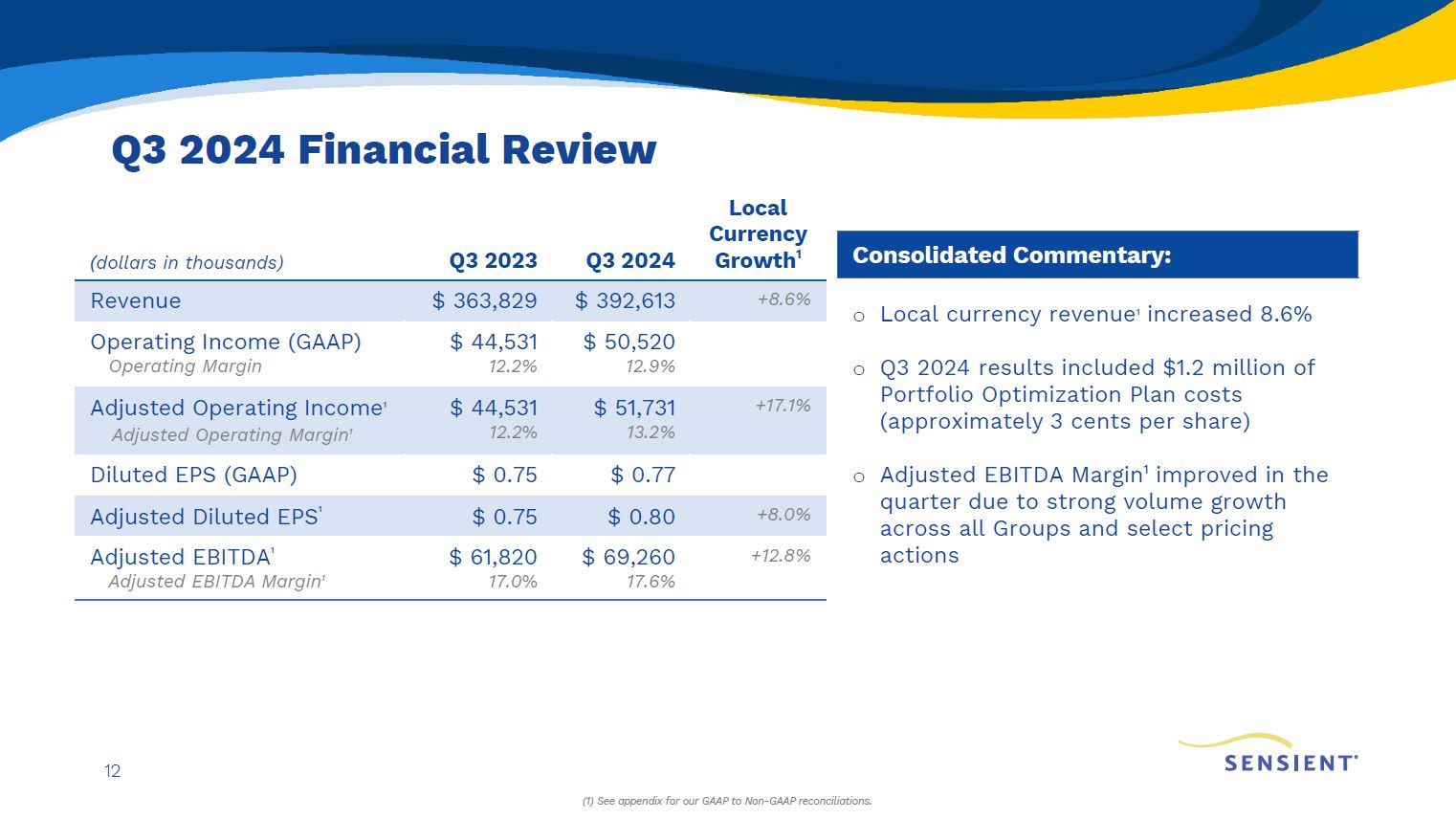 Q3 2024 Financial Review  12  (1) See appendix for our GAAP to Non-GAAP reconciliations.  (dollars in thousands)  Q3 2023  Q3 2024  Local  Currency Growth1  Revenue  $ 363,829  $ 392,613  +8.6%  Operating Income (GAAP)  $ 44,531  $ 50,520  Operating Margin  12.2%  12.9%  Adjusted Operating Income1  $ 44,531  $ 51,731  +17.1%  Adjusted Operating Margin1  12.2%  13.2%  Diluted EPS (GAAP)  $ 0.75  $ 0.77  Adjusted Diluted EPS1  $ 0.75  $ 0.80  +8.0%  Adjusted EBITDA1  $ 61,820  $ 69,260  +12.8%  Adjusted EBITDA Margin1  17.0%  17.6%  Consolidated Commentary:  Local currency revenue1 increased 8.6%  Q3 2024 results included $1.2 million of Portfolio Optimization Plan costs (approximately 3 cents per share)  Adjusted EBITDA Margin1 improved in the quarter due to strong volume growth across all Groups and select pricing actions