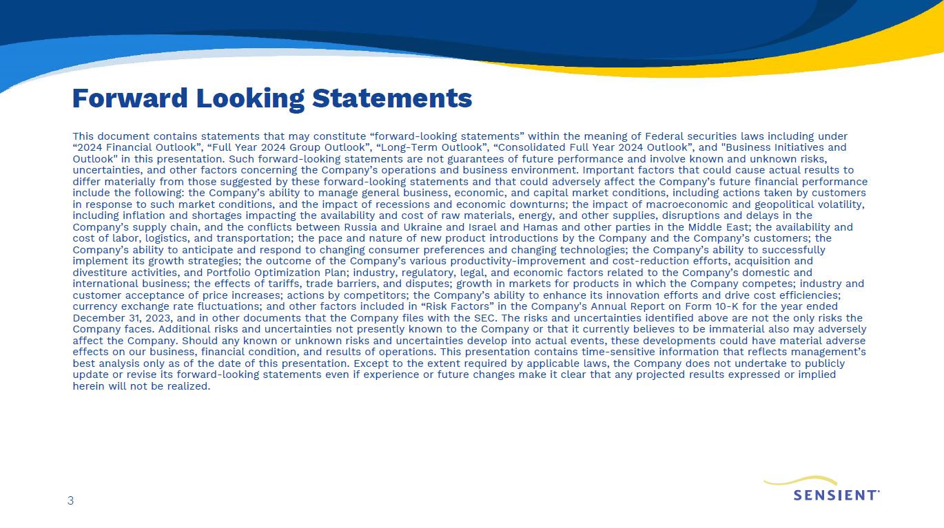 Forward Looking Statements  2  This document contains statements that may constitute “forward-looking statements” within the meaning of Federal securities laws including under “2024 Financial Outlook”, “Full Year 2024 Group Outlook”, “Long-Term Outlook”, “Consolidated Full Year 2024 Outlook”, and "Business Initiatives and Outlook" in this presentation. Such forward-looking statements are not guarantees of future performance and involve known and unknown risks, uncertainties, and other factors concerning the Company’s operations and business environment. Important factors that could cause actual results to differ materially from those suggested by these forward-looking statements and that could adversely affect the Company’s future financial performance include the following: the Company’s ability to manage general business, economic, and capital market conditions, including actions taken by customers in response to such market conditions, and the impact of recessions and economic downturns; the impact of macroeconomic and geopolitical volatility, including inflation and shortages impacting the availability and cost of raw materials, energy, and other supplies, disruptions and delays in the Company’s supply chain, and the conflicts between Russia and Ukraine and Israel and Hamas and other parties in the Middle East; the availability and cost of labor, logistics, and transportation; the pace and nature of new product introductions by the Company and the Company’s customers; the Company’s ability to anticipate and respond to changing consumer preferences and changing technologies; the Company’s ability to successfully implement its growth strategies; the outcome of the Company’s various productivity-improvement and cost-reduction efforts, acquisition and divestiture activities, and Portfolio Optimization Plan; industry, regulatory, legal, and economic factors related to the Company’s domestic and international business; the effects of tariffs, trade barriers, and disputes; growth in markets for products in which the Company competes; industry and customer acceptance of price increases; actions by competitors; the Company’s ability to enhance its innovation efforts and drive cost efficiencies; currency exchange rate fluctuations; and other factors included in “Risk Factors” in the Company's Annual Report on Form 10-K for the year ended December 31, 2023, and in other documents that the Company files with the SEC. The risks and uncertainties identified above are not the only risks the Company faces. Additional risks and uncertainties not presently known to the Company or that it currently believes to be immaterial also may adversely affect the Company. Should any known or unknown risks and uncertainties develop into actual events, these developments could have material adverse effects on our business, financial condition, and results of operations. This presentation contains time-sensitive information that reflects management’s best analysis only as of the date of this presentation. Except to the extent required by applicable laws, the Company does not undertake to publicly update or revise its forward-looking statements even if experience or future changes make it clear that any projected results expressed or implied herein will not be realized.