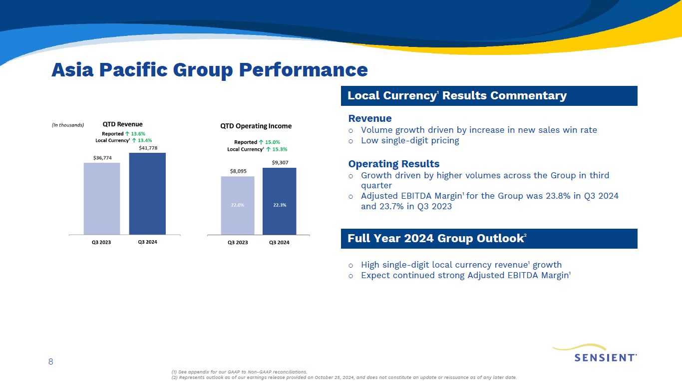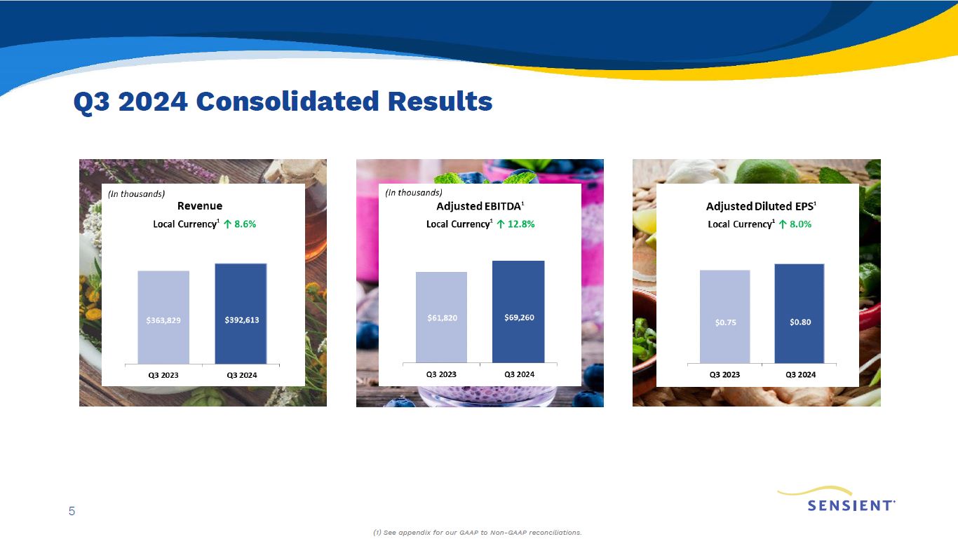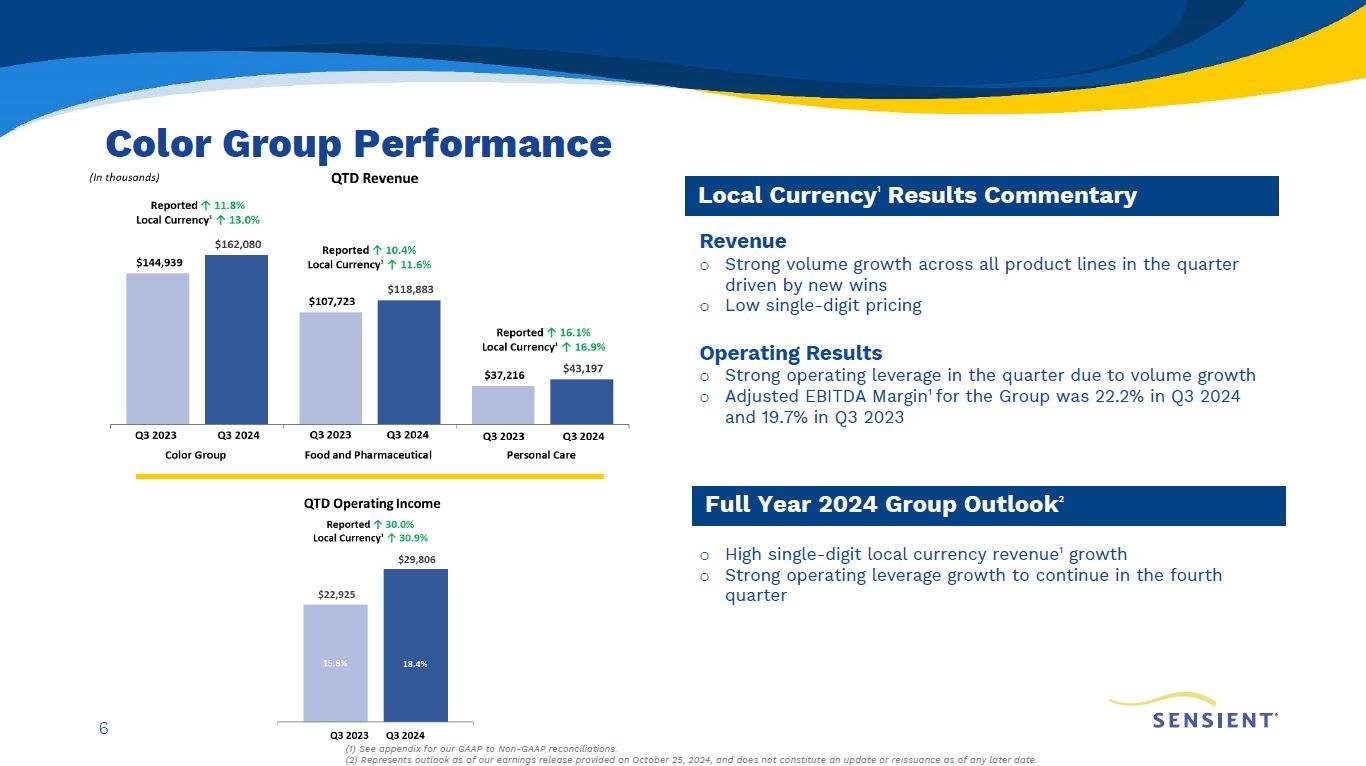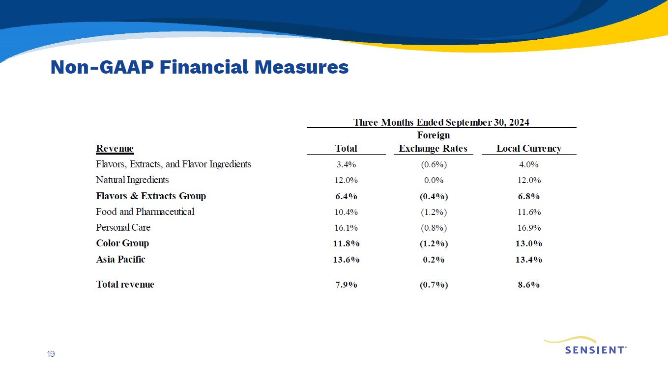 Non-GAAP Financial Measures  20  Three Months Ended September 30, 2024  Revenue   Total   Foreign   Exchange Rates    Local Currency   Flavors, Extracts, and Flavor Ingredients  3.4%  (0.6%)  4.0%  Natural Ingredients  12.0%  0.0%  12.0%  Flavors & Extracts Group  6.4%  (0.4%)  6.8%  Food and Pharmaceutical  10.4%  (1.2%)  11.6%  Personal Care  16.1%  (0.8%)  16.9%  Color Group  11.8%  (1.2%)  13.0%  Asia Pacific  13.6%  0.2%  13.4%  Total revenue  7.9%  (0.7%)  8.6%