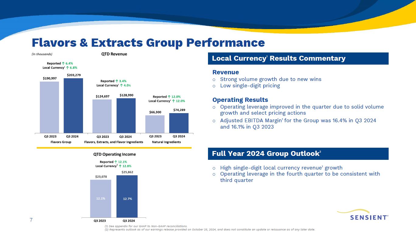 Revenue  Strong volume growth due to new wins  Low single-digit pricing  Operating Results  Operating leverage improved in the quarter due to solid volume growth and select pricing actions  Adjusted EBITDA Margin1 for the Group was 16.4% in Q3 2024 and 16.1% in Q3 2023  Flavors & Extracts Group Performance  Local Currency1 Results Commentary  Full Year 2024 Group Outlook2  High single-digit local currency revenue1 growth  Operating leverage in the fourth quarter to be consistent with third quarter  6  (1) See appendix for our GAAP to Non-GAAP reconciliations.  (2) Represents outlook as of our earnings release provided on October 25, 2024, and does not constitute an update or reissuance as of any later date.