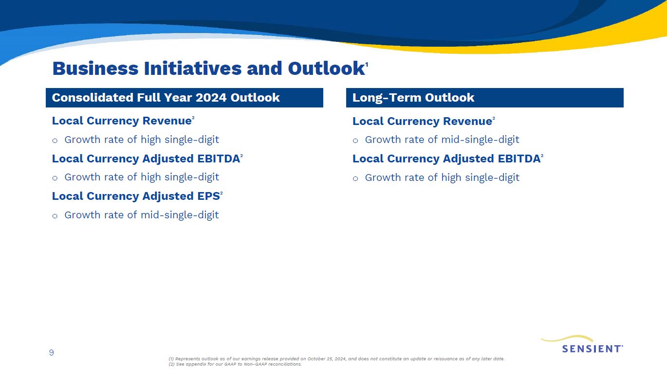 9  Local Currency Revenue2  Growth rate of mid-single-digit  Local Currency Adjusted EBITDA2  Growth rate of high single-digit  Business Initiatives and Outlook1  Long-Term Outlook  Local Currency Revenue2  Growth rate of high single-digit  Local Currency Adjusted EBITDA2  Growth rate of high single-digit  Local Currency Adjusted EPS2  Growth rate of mid-single-digit  Consolidated Full Year 2024 Outlook  Represents outlook as of our earnings release provided on October 25, 2024, and does not constitute an update or reissuance as of any later date.  See appendix for our GAAP to Non-GAAP reconciliations.