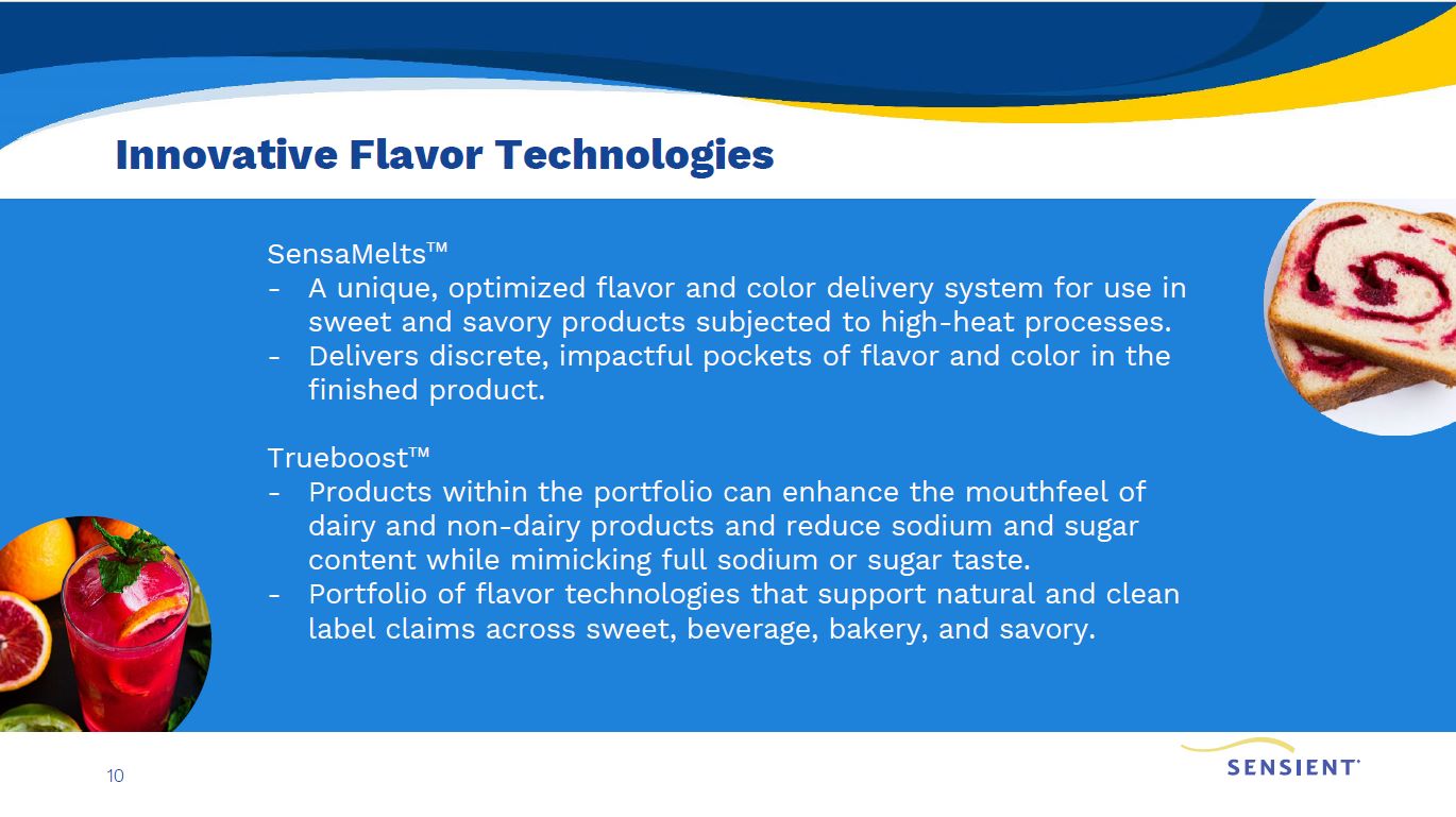 Innovative Flavor Technologies  SensaMeltsTM  A unique, optimized flavor and color delivery system for use in sweet and savory products subjected to high-heat processes.  Delivers discrete, impactful pockets of flavor and color in the finished product.  TrueboostTM  Products within the portfolio can enhance the mouthfeel of dairy and non-dairy products and reduce sodium and sugar content while mimicking full sodium or sugar taste.  Portfolio of flavor technologies that support natural and clean label claims across sweet, beverage, bakery, and savory.  10