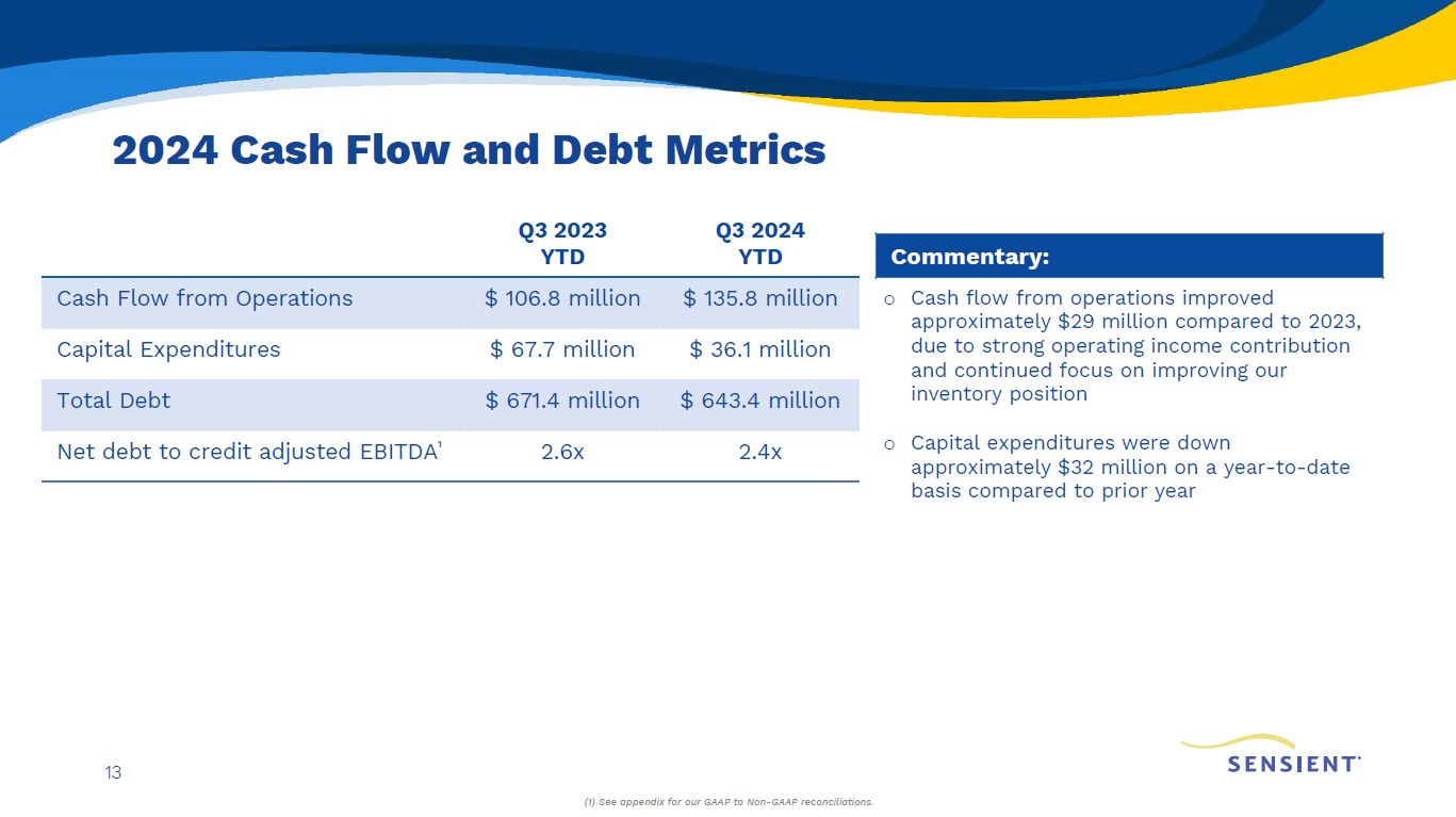2024 Cash Flow and Debt Metrics  12  (1) See appendix for our GAAP to Non-GAAP reconciliations.  Q3 2023  YTD  Q3 2024  YTD  Cash Flow from Operations  $ 106.8 million  $ 135.8 million  Capital Expenditures  $ 67.7 million  $ 36.1 million  Total Debt  $ 671.4 million  $ 643.4 million  Net debt to credit adjusted EBITDA1  2.6x  2.4x  Commentary:  Cash flow from operations improved approximately $29 million compared to 2023, due to strong operating income contribution and continued focus on improving our inventory position  Capital expenditures were down approximately $32 million on a year-to-date basis compared to prior year