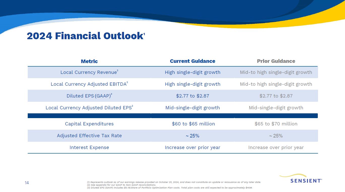 2024 Financial Outlook1  14  Metric  Current Guidance  Prior Guidance  Local Currency Revenue2  High single-digit growth  Mid-to high single-digit growth  Local Currency Adjusted EBITDA2  High single-digit growth  Mid-to high single-digit growth  Diluted EPS (GAAP)3  $2.77 to $2.87  $2.77 to $2.87  Local Currency Adjusted Diluted EPS2  Mid-single-digit growth  Mid-single-digit growth  Capital Expenditures  $60 to $65 million  $65 to $70 million  Adjusted Effective Tax Rate  ~ 25%  ~ 25%  Interest Expense  Increase over prior year  Increase over prior year  Represents outlook as of our earnings release provided on October 25, 2024, and does not constitute an update or reissuance as of any later date.  See appendix for our GAAP to Non-GAAP reconciliations.  Diluted EPS (GAAP) includes $0.18/share of Portfolio Optimization Plan costs. Total plan costs are still expected to be approximately $40M.