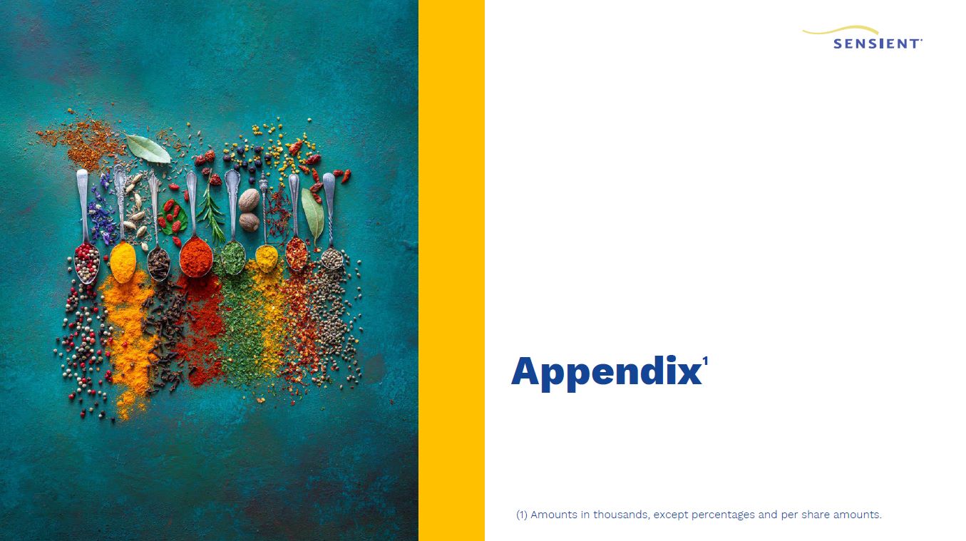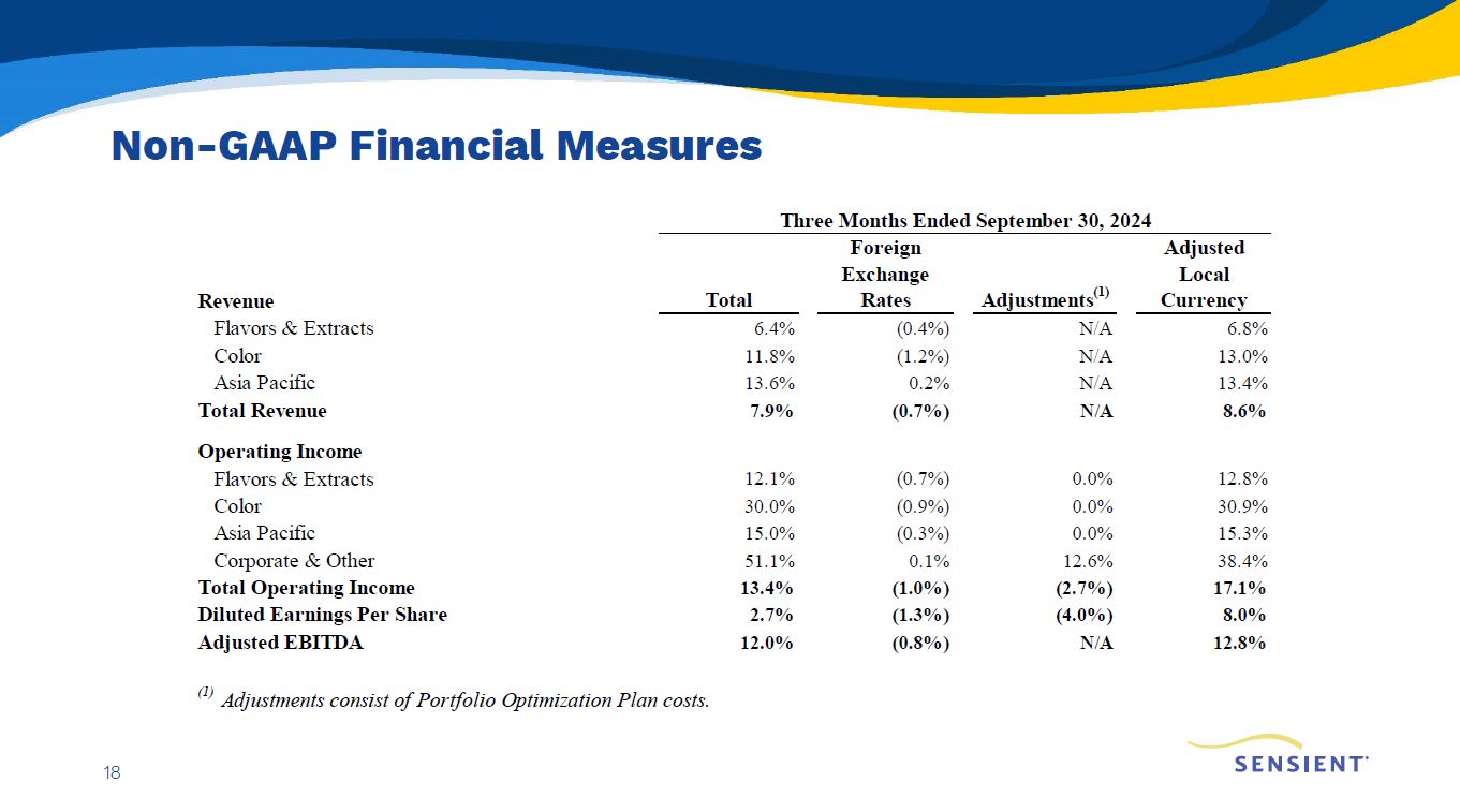 Non-GAAP Financial Measures  20  Revenue Total   Foreign  Exchange   Rates   Adjustments(1)  Adjusted  Local   Currency   Flavors & Extracts 6.4%  (0.4%)  N/A  6.8%  Color 11.8%  (1.2%)  N/A  13.0%  Asia Pacific 13.6%  0.2%  N/A  13.4%  Total Revenue 7.9%  (0.7%)  N/A  8.6%  Operating Income  Flavors & Extracts 12.1%  (0.7%)  0.0%  12.8%  Color 30.0%  (0.9%)  0.0%  30.9%  Asia Pacific 15.0%  (0.3%)  0.0%  15.3%  Corporate & Other 51.1%  0.1%  12.6%  38.4%  Total Operating Income 13.4%  (1.0%)  (2.7%)  17.1%  Diluted Earnings Per Share 2.7%  (1.3%)  (4.0%)  8.0%  Adjusted EBITDA 12.0%  (0.8%)  N/A  12.8%  (1) Adjustments consist of Portfolio Optimization Plan costs.  Three Months Ended September 30, 2024