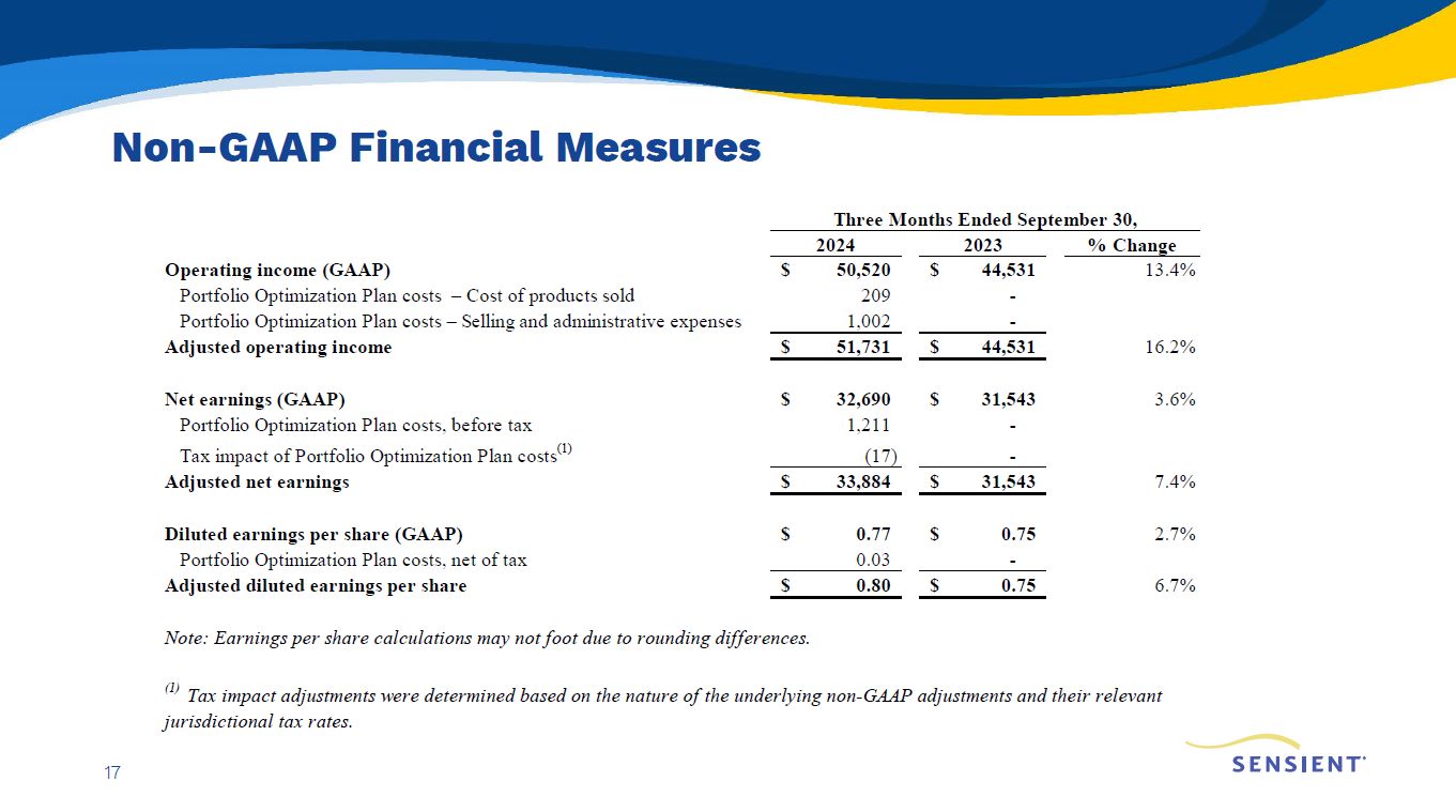 Non-GAAP Financial Measures  20   2024   2023   % Change   Operating income (GAAP)  $ 50,520  $ 44,531  13.4%  Portfolio Optimization Plan costs – Cost of products sold  209  -  Portfolio Optimization Plan costs – Selling and administrative expenses   1,002   -  Adjusted operating income   $ 51,731   $ 44,531  16.2%  Net earnings (GAAP)  $ 32,690  $ 31,543  3.6%  Portfolio Optimization Plan costs, before tax  1,211  -  Tax impact of Portfolio Optimization Plan costs(1)   (17)  -  Adjusted net earnings   $ 33,884   $ 31,543  7.4%  Diluted earnings per share (GAAP)  $ 0.77  $ 0.75  2.7%  Portfolio Optimization Plan costs, net of tax   0.03   -  Adjusted diluted earnings per share   $ 0.80   $ 0.75  6.7%  Note: Earnings per share calculations may not foot due to rounding differences.  (1) Tax impact adjustments were determined based on the nature of the underlying non-GAAP adjustments and their relevant jurisdictional tax rates.   Three Months Ended September 30,