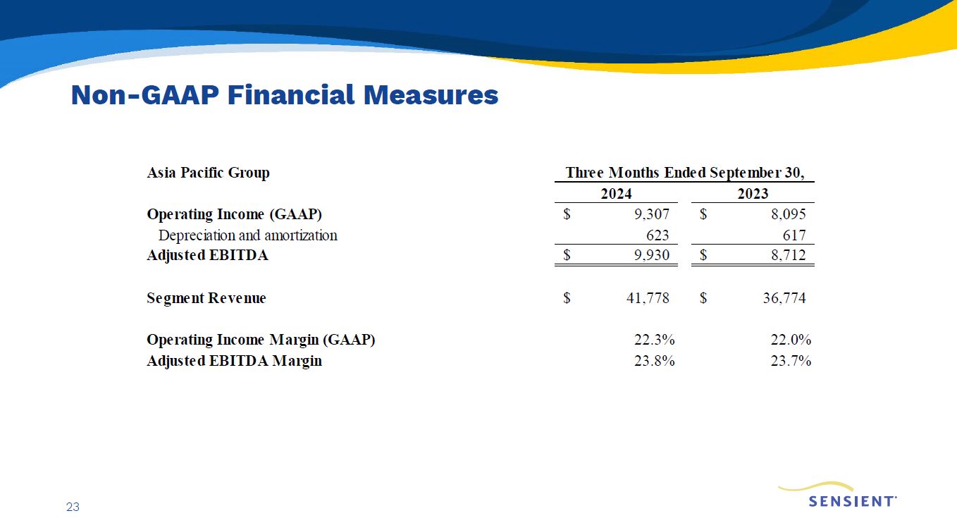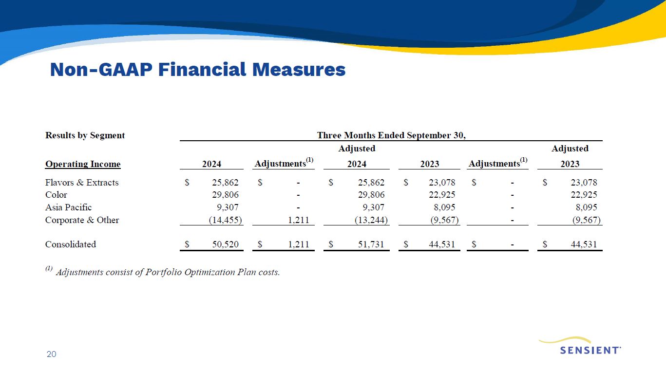 Non-GAAP Financial Measures  Results by Segment  Operating Income  Adjusted  Adjusted   2024   Adjustments(1)   2024    2023   Adjustments(1)   2023   Flavors & Extracts  $ 25,862  $ -  $ 25,862  $ 23,078  $ - $ 23,078  Color  29,806  -  29,806  22,925  - 22,925  Asia Pacific  9,307  -  9,307  8,095  - 8,095  Corporate & Other   (14,455)   1,211    (13,244)   (9,567)   - (9,567)  Consolidated   $ 50,520    $ 1,211    $ 51,731    $ 44,531    $ - $ 44,531    Three Months Ended September 30,   (1) Adjustments consist of Portfolio Optimization Plan costs.  20