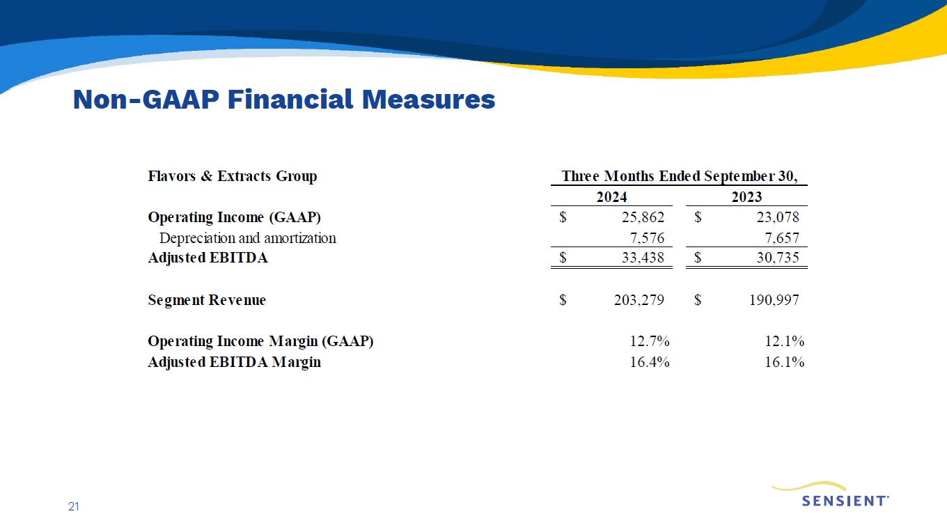Non-GAAP Financial Measures  20  Flavors & Extracts Group   2024    2023   Operating Income (GAAP)  $ 25,862  $ 23,078  Depreciation and amortization   7,576    7,657   Adjusted EBITDA   $ 33,438    $ 30,735   Segment Revenue  $  203,279  $  190,997  Operating Income Margin (GAAP)  12.7%  12.1%  Adjusted EBITDA Margin  16.4%  16.1%   Three Months Ended September 30,