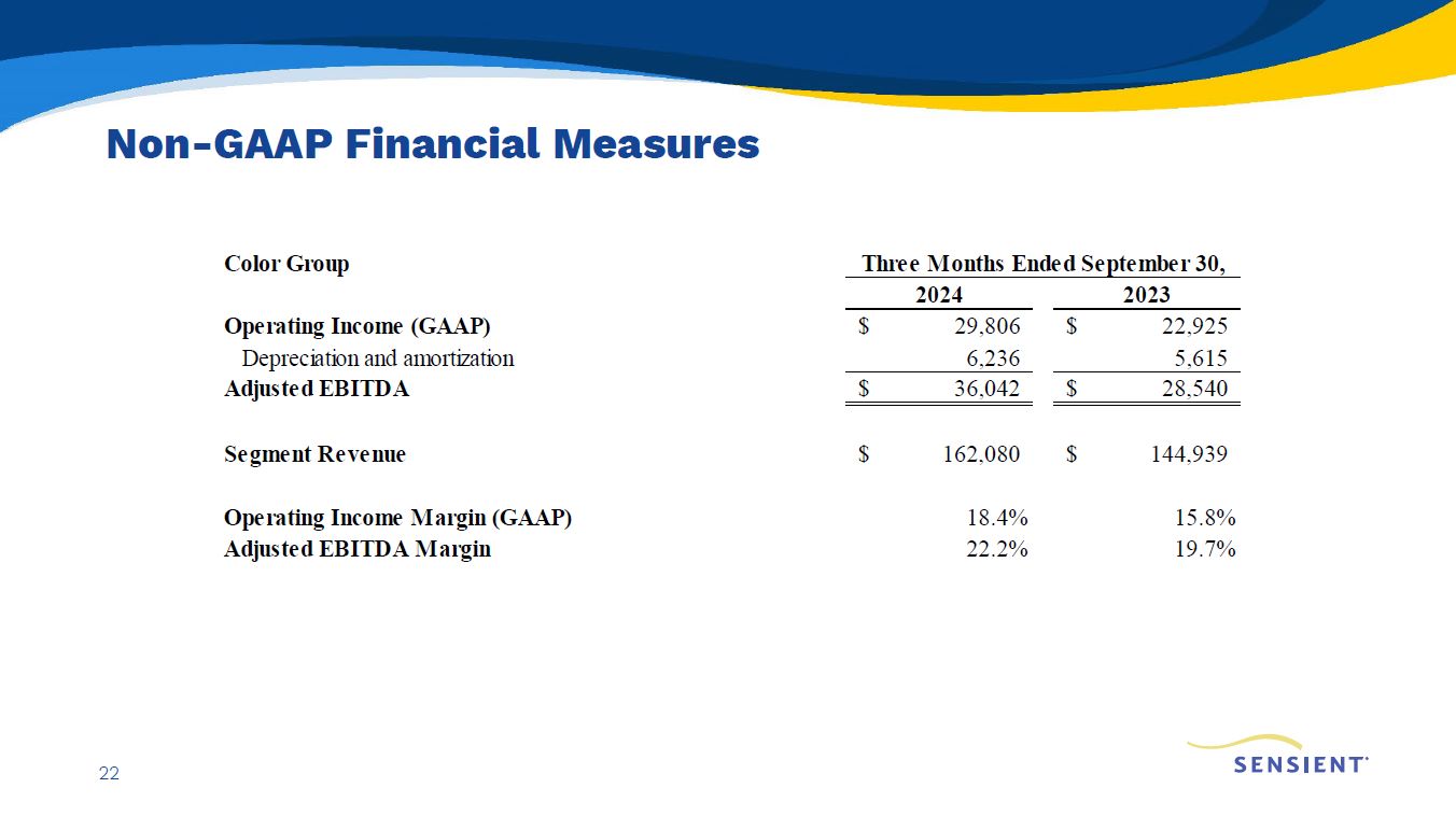 Non-GAAP Financial Measures  20  Color Group   2024    2023   Operating Income (GAAP)  $ 29,806  $ 22,925  Depreciation and amortization   6,236    5,615   Adjusted EBITDA   $ 36,042    $ 28,540   Segment Revenue  $  162,080  $  144,939  Operating Income Margin (GAAP)  18.4%  15.8%  Adjusted EBITDA Margin  22.2%  19.7%   Three Months Ended September 30,