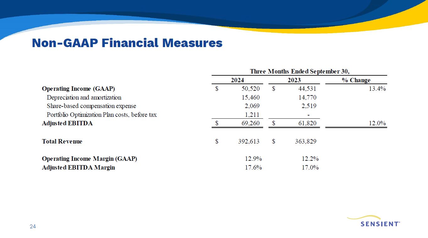 Non-GAAP Financial Measures  20   2024    2023    % Change   Operating Income (GAAP)  $ 50,520  $ 44,531  13.4%  Depreciation and amortization  15,460  14,770  Share-based compensation expense  2,069  2,519  Portfolio Optimization Plan costs, before tax   1,211    -   Adjusted EBITDA   $ 69,260    $ 61,820    12.0%  Total Revenue  $ 392,613  $ 363,829  Operating Income Margin (GAAP)  12.9%  12.2%  Adjusted EBITDA Margin  17.6%  17.0%  Three Months Ended September 30,