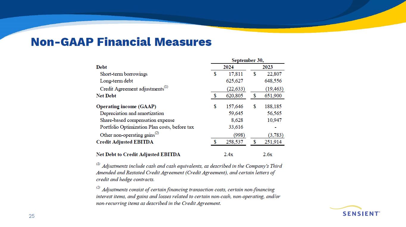 Non-GAAP Financial Measures  20  Debt   2024    2023   Short-term borrowings  $ 17,811  $ 22,807  Long-term debt  625,627  648,556  Credit Agreement adjustments(1)   (22,633)   (19,463)  Net Debt   $ 620,805    $ 651,900   Operating income (GAAP)  $ 157,646  $ 188,185  Depreciation and amortization  59,645  56,565  Share-based compensation expense  8,628  10,947  Portfolio Optimization Plan costs, before tax  33,616  -  Other non-operating gains(2)   (998)   (3,783)  Credit Adjusted EBITDA   $ 258,537    $ 251,914   Net Debt to Credit Adjusted EBITDA  2.4x  2.6x  (1) Adjustments include cash and cash equivalents, as described in the Company's Third Amended and Restated Credit Agreement (Credit Agreement), and certain letters of credit and hedge contracts.  (2) Adjustments consist of certain financing transaction costs, certain non-financing interest items, and gains and losses related to certain non-cash, non-operating, and/or non-recurring items as described in the Credit Agreement.   September 30,