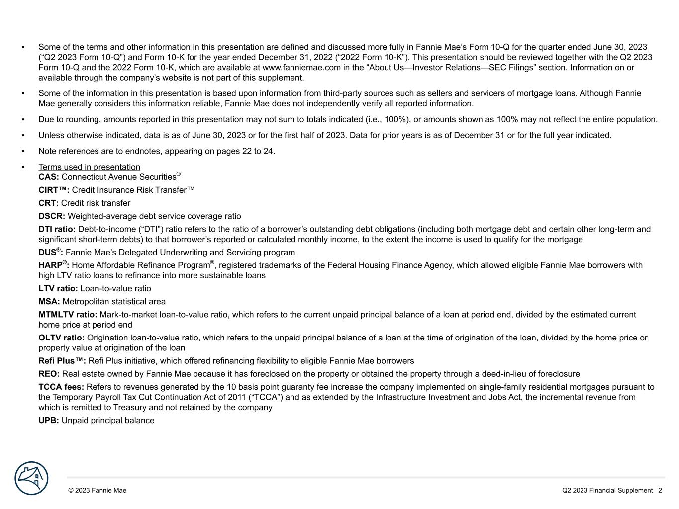Q2 2023 Financial Supplement 2© 2023 Fannie Mae DRAFT ▪ Some of the terms and other information in this presentation are defined and discussed more fully in Fannie Mae’s Form 10-Q for the quarter ended June 30, 2023 (“Q2 2023 Form 10-Q”) and Form 10-K for the year ended December 31, 2022 (“2022 Form 10-K”). This presentation should be reviewed together with the Q2 2023 Form 10-Q and the 2022 Form 10-K, which are available at www.fanniemae.com in the “About Us—Investor Relations—SEC Filings” section. Information on or available through the company’s website is not part of this supplement. ▪ Some of the information in this presentation is based upon information from third-party sources such as sellers and servicers of mortgage loans. Although Fannie Mae generally considers this information reliable, Fannie Mae does not independently verify all reported information. ▪ Due to rounding, amounts reported in this presentation may not sum to totals indicated (i.e., 100%), or amounts shown as 100% may not reflect the entire population. ▪ Unless otherwise indicated, data is as of June 30, 2023 or for the first half of 2023. Data for prior years is as of December 31 or for the full year indicated. ▪ Note references are to endnotes, appearing on pages 22 to 24. ▪ Terms used in presentation CAS: Connecticut Avenue Securities® CIRT™: Credit Insurance Risk Transfer™ CRT: Credit risk transfer DSCR: Weighted-average debt service coverage ratio DTI ratio: Debt-to-income (“DTI”) ratio refers to the ratio of a borrower’s outstanding debt obligations (including both mortgage debt and certain other long-term and significant short-term debts) to that borrower’s reported or calculated monthly income, to the extent the income is used to qualify for the mortgage DUS®: Fannie Mae’s Delegated Underwriting and Servicing program HARP®: Home Affordable Refinance Program®, registered trademarks of the Federal Housing Finance Agency, which allowed eligible Fannie Mae borrowers with high LTV ratio loans to refinance into more sustainable loans LTV ratio: Loan-to-value ratio MSA: Metropolitan statistical area MTMLTV ratio: Mark-to-market loan-to-value ratio, which refers to the current unpaid principal balance of a loan at period end, divided by the estimated current home price at period end OLTV ratio: Origination loan-to-value ratio, which refers to the unpaid principal balance of a loan at the time of origination of the loan, divided by the home price or property value at origination of the loan Refi Plus™: Refi Plus initiative, which offered refinancing flexibility to eligible Fannie Mae borrowers REO: Real estate owned by Fannie Mae because it has foreclosed on the property or obtained the property through a deed-in-lieu of foreclosure TCCA fees: Refers to revenues generated by the 10 basis point guaranty fee increase the company implemented on single-family residential mortgages pursuant to the Temporary Payroll Tax Cut Continuation Act of 2011 (“TCCA”) and as extended by the Infrastructure Investment and Jobs Act, the incremental revenue from which is remitted to Treasury and not retained by the company UPB: Unpaid principal balance
