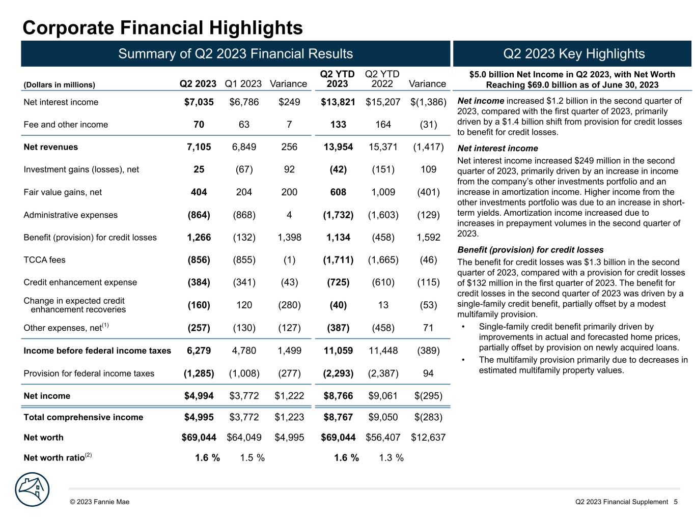 Q2 2023 Financial Supplement 5© 2023 Fannie Mae DRAFT Net income increased $1.2 billion in the second quarter of 2023, compared with the first quarter of 2023, primarily driven by a $1.4 billion shift from provision for credit losses to benefit for credit losses. Net interest income Net interest income increased $249 million in the second quarter of 2023, primarily driven by an increase in income from the company’s other investments portfolio and an increase in amortization income. Higher income from the other investments portfolio was due to an increase in short- term yields. Amortization income increased due to increases in prepayment volumes in the second quarter of 2023. Benefit (provision) for credit losses The benefit for credit losses was $1.3 billion in the second quarter of 2023, compared with a provision for credit losses of $132 million in the first quarter of 2023. The benefit for credit losses in the second quarter of 2023 was driven by a single-family credit benefit, partially offset by a modest multifamily provision. • Single-family credit benefit primarily driven by improvements in actual and forecasted home prices, partially offset by provision on newly acquired loans. • The multifamily provision primarily due to decreases in estimated multifamily property values. Corporate Financial Highlights (Dollars in millions) Q2 2023 Q1 2023 Variance Q2 YTD 2023 Q2 YTD 2022 Variance Net interest income $7,035 $6,786 $249 $13,821 $15,207 $(1,386) Fee and other income 70 63 7 133 164 (31) Net revenues 7,105 6,849 256 13,954 15,371 (1,417) Investment gains (losses), net 25 (67) 92 (42) (151) 109 Fair value gains, net 404 204 200 608 1,009 (401) Administrative expenses (864) (868) 4 (1,732) (1,603) (129) Benefit (provision) for credit losses 1,266 (132) 1,398 1,134 (458) 1,592 TCCA fees (856) (855) (1) (1,711) (1,665) (46) Credit enhancement expense (384) (341) (43) (725) (610) (115) Change in expected credit enhancement recoveries (160) 120 (280) (40) 13 (53) Other expenses, net(1) (257) (130) (127) (387) (458) 71 Income before federal income taxes 6,279 4,780 1,499 11,059 11,448 (389) Provision for federal income taxes (1,285) (1,008) (277) (2,293) (2,387) 94 Net income $4,994 $3,772 $1,222 $8,766 $9,061 $(295) Total comprehensive income $4,995 $3,772 $1,223 $8,767 $9,050 $(283) Net worth $69,044 $64,049 $4,995 $69,044 $56,407 $12,637 Net worth ratio(2) 1.6 % 1.5 % 1.6 % 1.3 % Summary of Q2 2023 Financial Results Q2 2023 Key Highlights $5.0 billion Net Income in Q2 2023, with Net Worth Reaching $69.0 billion as of June 30, 2023