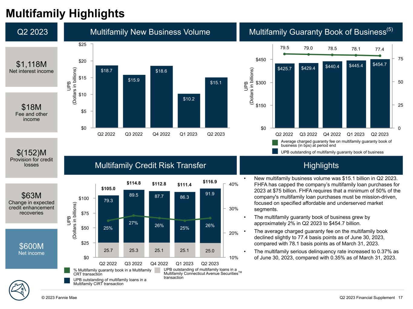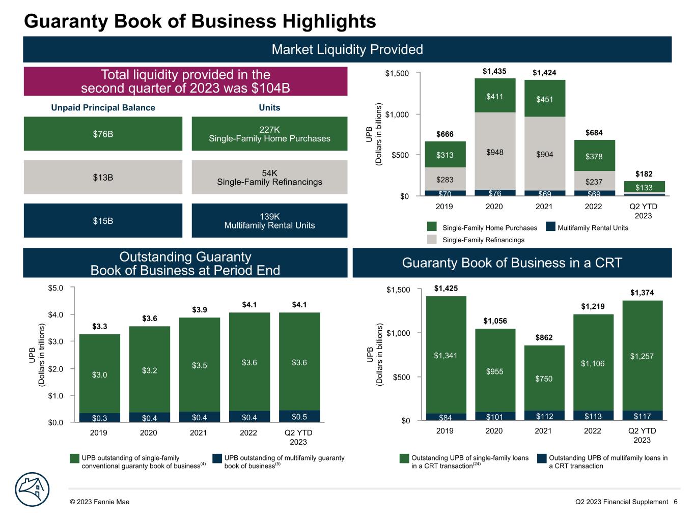 Q2 2023 Financial Supplement 3© 2023 Fannie Mae DRAFTTable of Contents Overview Corporate Financial Highlights 5 Guaranty Book of Business Highlights 6 Interest Income and Liquidity Management 7 Key Market Economic Indicators 8 Single-Family Business Single-Family Highlights 10 Credit Characteristics of Single-Family Conventional Loan Acquisitions 11 Credit Characteristics of Single-Family Conventional Guaranty Book of Business 12 Single-Family Credit Risk Transfer 13 Single-Family Problem Loan Statistics 14 Single-Family Cumulative Default Rates 15 Multifamily Business Multifamily Highlights 17 Credit Characteristics of Multifamily Loan Acquisitions 18 Credit Characteristics of Multifamily Guaranty Book of Business 19 Multifamily Credit Loss and Serious Delinquency Rates 20 Endnotes Endnotes 22