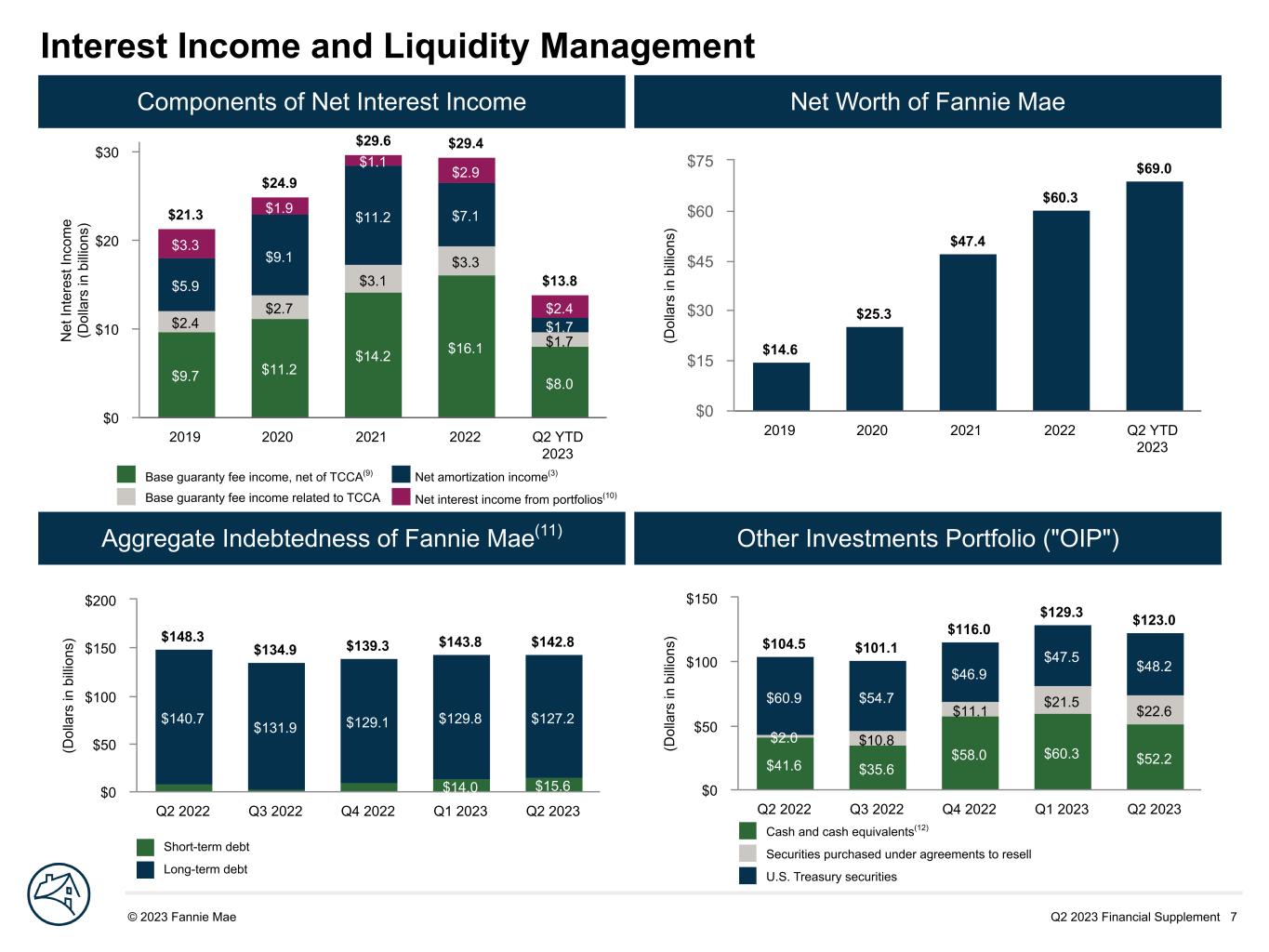 Q2 2023 Financial Supplement 7© 2023 Fannie Mae DRAFTInterest Income and Liquidity Management Components of Net Interest Income Net Worth of Fannie Mae Aggregate Indebtedness of Fannie Mae(11) Other Investments Portfolio ("OIP") N et In te re st In co m e (D ol la rs in b ill io ns ) $21.3 $24.9 $29.6 $29.4 $13.8 $9.7 $11.2 $14.2 $16.1 $8.0 $2.4 $2.7 $3.1 $3.3 $1.7 $5.9 $9.1 $11.2 $7.1 $1.7 $3.3 $1.9 $1.1 $2.9 $2.4 2019 2020 2021 2022 Q2 YTD 2023 $0 $10 $20 $30 Base guaranty fee income, net of TCCA(9) Net amortization income(3) Base guaranty fee income related to TCCA Net interest income from portfolios(10) (D ol la rs in b ill io ns ) $14.0 $15.6 $140.7 $131.9 $129.1 $129.8 $127.2 $148.3 $134.9 $139.3 $143.8 $142.8 Q2 2022 Q3 2022 Q4 2022 Q1 2023 Q2 2023 $0 $50 $100 $150 $200 (D ol la rs in b ill io ns ) $41.6 $35.6 $58.0 $60.3 $52.2 $2.0 $10.8 $11.1 $21.5 $22.6 $60.9 $54.7 $46.9 $47.5 $48.2 $104.5 $101.1 $116.0 $129.3 $123.0 Q2 2022 Q3 2022 Q4 2022 Q1 2023 Q2 2023 $0 $50 $100 $150 Cash and cash equivalents(12) Securities purchased under agreements to resell U.S. Treasury securities Short-term debt Long-term debt (D ol la rs in b ill io ns ) $14.6 $25.3 $47.4 $60.3 $69.0 2019 2020 2021 2022 Q2 YTD 2023 $0 $15 $30 $45 $60 $75