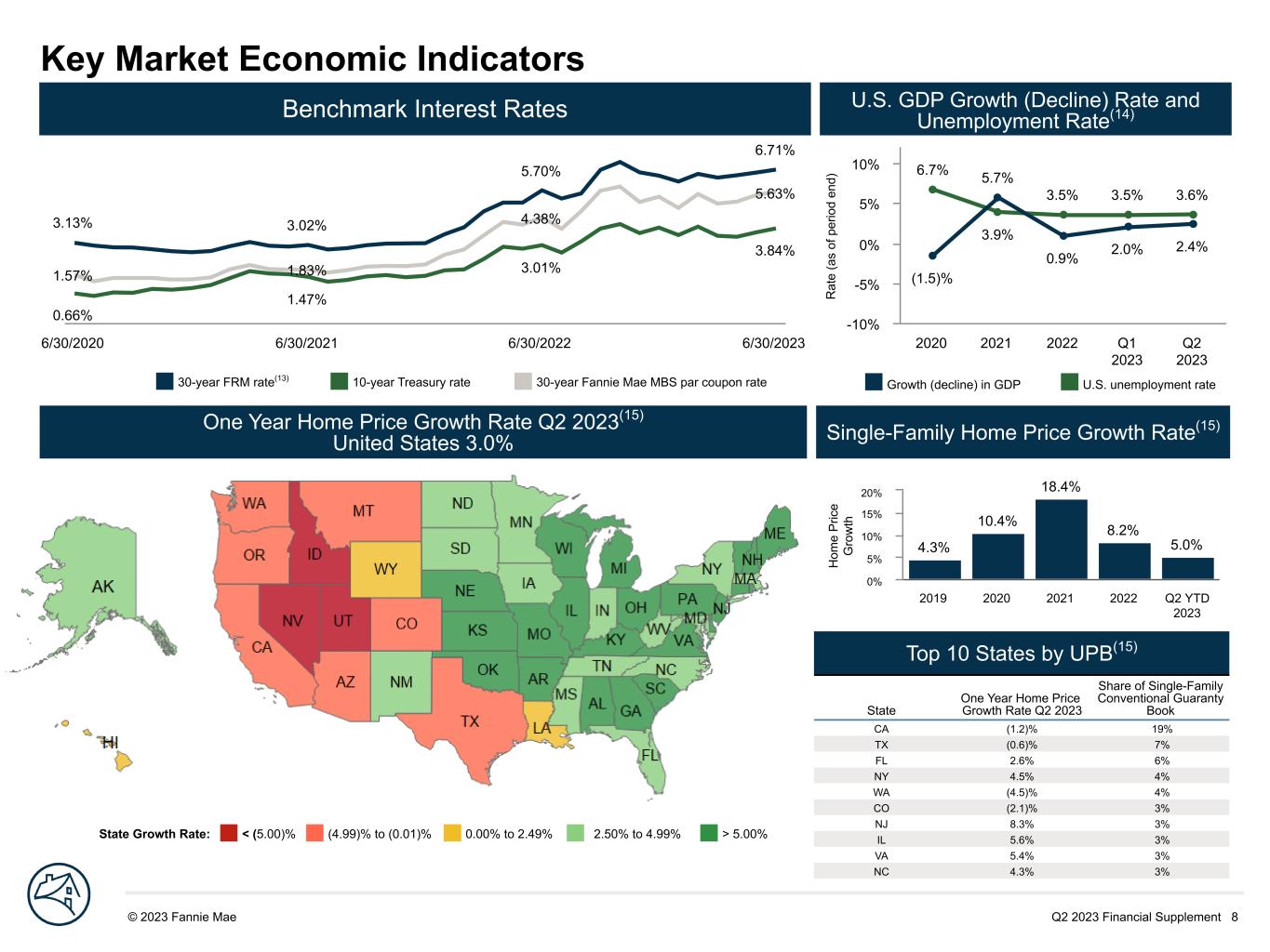 Q2 2023 Financial Supplement 8© 2023 Fannie Mae DRAFT R at e (a s of p er io d en d) 6.7% 3.9% 3.5% 3.5% 3.6% (1.5)% 5.7% 0.9% 2.0% 2.4% 2020 2021 2022 Q1 2023 Q2 2023 -10% -5% 0% 5% 10% Key Market Economic Indicators 0.66% 1.47% 3.01% 3.84% 1.57% 1.83% 4.38% 5.63% 3.13% 3.02% 5.70% 6.71% 6/30/2020 6/30/2021 6/30/2022 6/30/2023 Top 10 States by UPB(15) State One Year Home Price Growth Rate Q2 2023 Share of Single-Family Conventional Guaranty Book CA (1.2)% 19% TX (0.6)% 7% FL 2.6% 6% NY 4.5% 4% WA (4.5)% 4% CO (2.1)% 3% NJ 8.3% 3% IL 5.6% 3% VA 5.4% 3% NC 4.3% 3% H om e P ric e G ro w th 4.3% 10.4% 18.4% 8.2% 5.0% 2019 2020 2021 2022 Q2 YTD 2023 0% 5% 10% 15% 20% Benchmark Interest Rates U.S. GDP Growth (Decline) Rate and Unemployment Rate(14) One Year Home Price Growth Rate Q2 2023(15) United States 3.0% Single-Family Home Price Growth Rate(15) Growth (decline) in GDP U.S. unemployment rate30-year FRM rate(13) 10-year Treasury rate 30-year Fannie Mae MBS par coupon rate State Growth Rate: < (5.00)% (4.99)% to (0.01)% 0.00% to 2.49% 2.50% to 4.99% > 5.00%