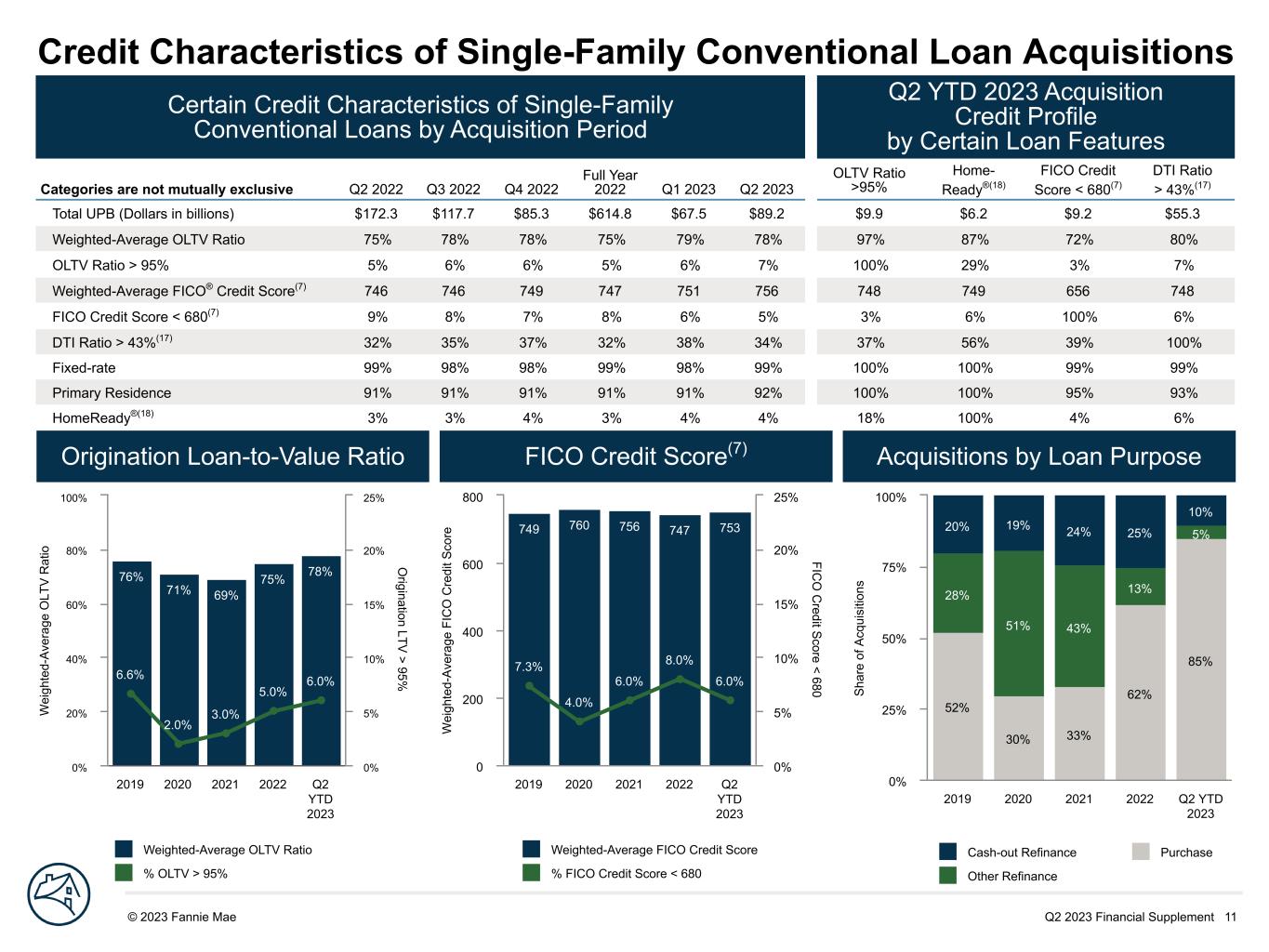Q2 2023 Financial Supplement 11© 2023 Fannie Mae DRAFT S ha re o f A cq ui si tio ns 52% 30% 33% 62% 85% 28% 51% 43% 13% 5%20% 19% 24% 25% 10% 2019 2020 2021 2022 Q2 YTD 2023 0% 25% 50% 75% 100% W ei gh te d- A ve ra ge F IC O C re di t S co re FIC O C redit S core < 680 749 760 756 747 753 7.3% 4.0% 6.0% 8.0% 6.0% 2019 2020 2021 2022 Q2 YTD 2023 0 200 400 600 800 0% 5% 10% 15% 20% 25% Credit Characteristics of Single-Family Conventional Loan Acquisitions Certain Credit Characteristics of Single-Family Conventional Loans by Acquisition Period Q2 YTD 2023 Acquisition Credit Profile by Certain Loan Features Categories are not mutually exclusive Q2 2022 Q3 2022 Q4 2022 Full Year 2022 Q1 2023 Q2 2023 OLTV Ratio >95% Home- Ready®(18) FICO Credit Score < 680(7) DTI Ratio > 43%(17) Total UPB (Dollars in billions) $172.3 $117.7 $85.3 $614.8 $67.5 $89.2 $9.9 $6.2 $9.2 $55.3 Weighted-Average OLTV Ratio 75% 78% 78% 75% 79% 78% 97% 87% 72% 80% OLTV Ratio > 95% 5% 6% 6% 5% 6% 7% 100% 29% 3% 7% Weighted-Average FICO® Credit Score(7) 746 746 749 747 751 756 748 749 656 748 FICO Credit Score < 680(7) 9% 8% 7% 8% 6% 5% 3% 6% 100% 6% DTI Ratio > 43%(17) 32% 35% 37% 32% 38% 34% 37% 56% 39% 100% Fixed-rate 99% 98% 98% 99% 98% 99% 100% 100% 99% 99% Primary Residence 91% 91% 91% 91% 91% 92% 100% 100% 95% 93% HomeReady®(18) 3% 3% 4% 3% 4% 4% 18% 100% 4% 6% W ei gh te d- A ve ra ge O LT V R at io O rigination LTV > 95% 76% 71% 69% 75% 78% 6.6% 2.0% 3.0% 5.0% 6.0% 2019 2020 2021 2022 Q2 YTD 2023 0% 20% 40% 60% 80% 100% 0% 5% 10% 15% 20% 25% Origination Loan-to-Value Ratio FICO Credit Score(7) Acquisitions by Loan Purpose Weighted-Average OLTV Ratio % OLTV > 95% Weighted-Average FICO Credit Score % FICO Credit Score < 680 Cash-out Refinance Purchase Other Refinance