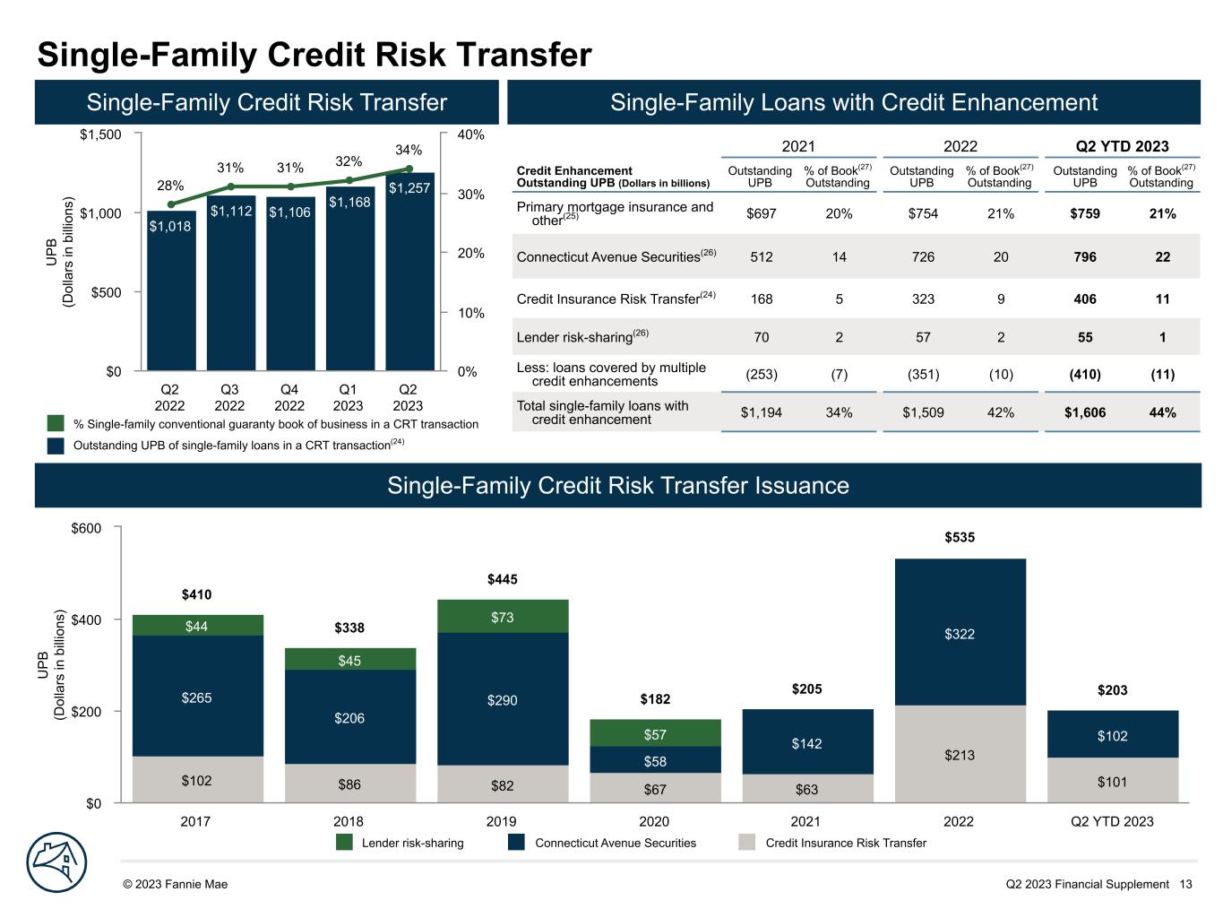 Q2 2023 Financial Supplement 13© 2023 Fannie Mae DRAFT U P B (D ol la rs in b ill io ns ) $102 $86 $82 $67 $63 $213 $101 $265 $206 $290 $58 $142 $322 $102 $44 $45 $73 $57 $410 $338 $445 $182 $205 $535 $203 2017 2018 2019 2020 2021 2022 Q2 YTD 2023 $0 $200 $400 $600 Single-Family Credit Risk Transfer U P B (D ol la rs in b ill io ns ) $1,018 $1,112 $1,106 $1,168 $1,25728% 31% 31% 32% 34% Q2 2022 Q3 2022 Q4 2022 Q1 2023 Q2 2023 $0 $500 $1,000 $1,500 0% 10% 20% 30% 40% 2021 2022 Q2 YTD 2023 Credit Enhancement Outstanding UPB (Dollars in billions) Outstanding UPB % of Book(27) Outstanding Outstanding UPB % of Book(27) Outstanding Outstanding UPB % of Book(27) Outstanding Primary mortgage insurance and other(25) $697 20% $754 21% $759 21% Connecticut Avenue Securities(26) 512 14 726 20 796 22 Credit Insurance Risk Transfer(24) 168 5 323 9 406 11 Lender risk-sharing(26) 70 2 57 2 55 1 Less: loans covered by multiple credit enhancements (253) (7) (351) (10) (410) (11) Total single-family loans with credit enhancement $1,194 34% $1,509 42% $1,606 44% Single-Family Credit Risk Transfer Issuance Single-Family Credit Risk Transfer Single-Family Loans with Credit Enhancement % Single-family conventional guaranty book of business in a CRT transaction Outstanding UPB of single-family loans in a CRT transaction(24) Lender risk-sharing Connecticut Avenue Securities Credit Insurance Risk Transfer
