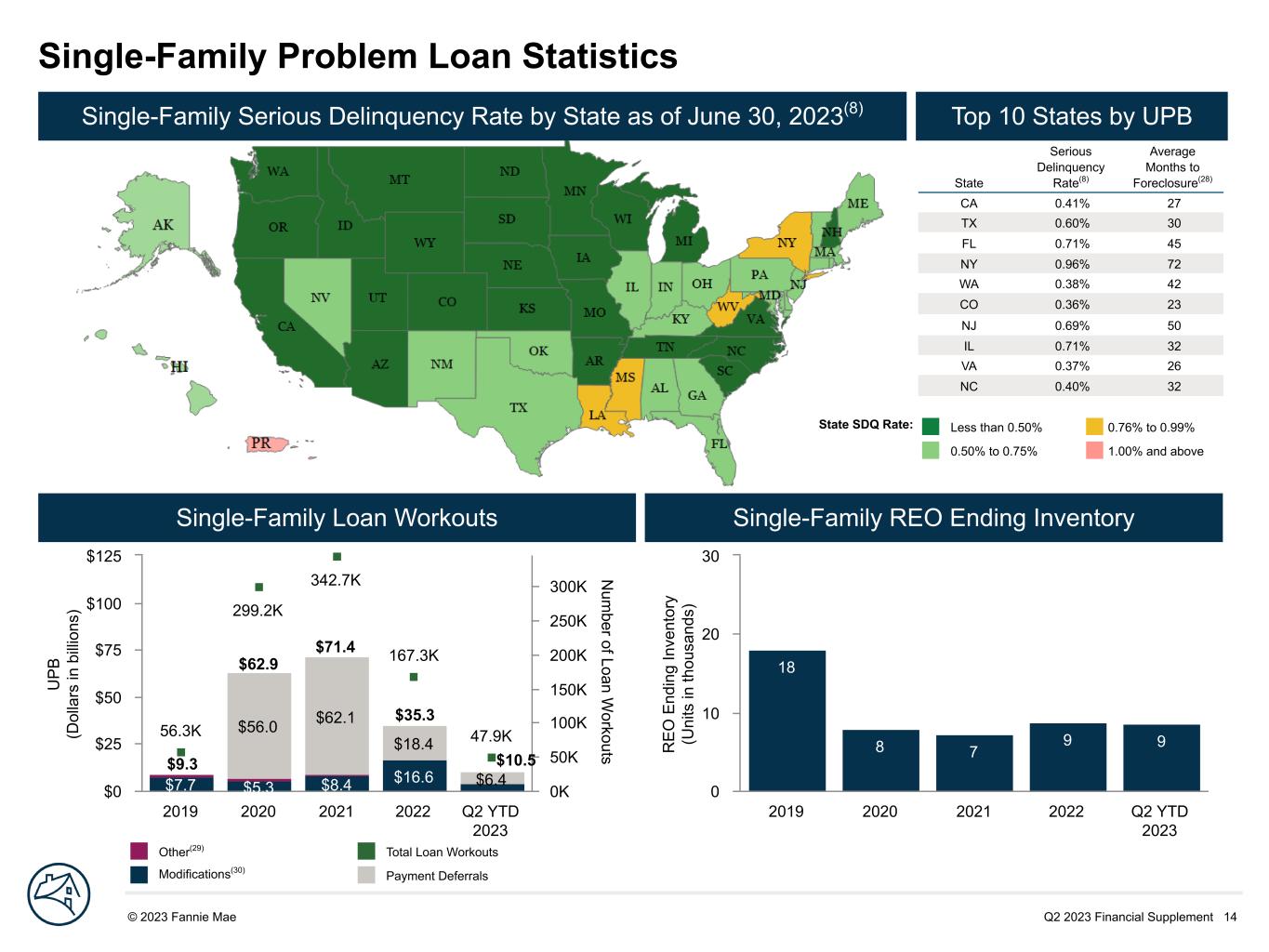 Q2 2023 Financial Supplement 14© 2023 Fannie Mae DRAFT U P B (D ol la rs in b ill io ns ) N um ber of Loan W orkouts $7.7 $5.3 $8.4 $16.6 $56.0 $62.1 $18.4 $6.4 56.3K 299.2K 342.7K 167.3K 47.9K 2019 2020 2021 2022 Q2 YTD 2023 $0 $25 $50 $75 $100 $125 0K 50K 100K 150K 200K 250K 300K R E O E nd in g In ve nt or y (U ni ts in th ou sa nd s) 18 8 7 9 9 2019 2020 2021 2022 Q2 YTD 2023 0 10 20 30 Single-Family Problem Loan Statistics State Serious Delinquency Rate(8) Average Months to Foreclosure(28) CA 0.41% 27 TX 0.60% 30 FL 0.71% 45 NY 0.96% 72 WA 0.38% 42 CO 0.36% 23 NJ 0.69% 50 IL 0.71% 32 VA 0.37% 26 NC 0.40% 32 Single-Family Serious Delinquency Rate by State as of June 30, 2023(8) Top 10 States by UPB Single-Family Loan Workouts Single-Family REO Ending Inventory Less than 0.50% 0.76% to 0.99% 0.50% to 0.75% 1.00% and above Other(29) Total Loan Workouts Modifications(30) Payment Deferrals $71.4 $62.9 $9.3 $35.3 $10.5 State SDQ Rate:
