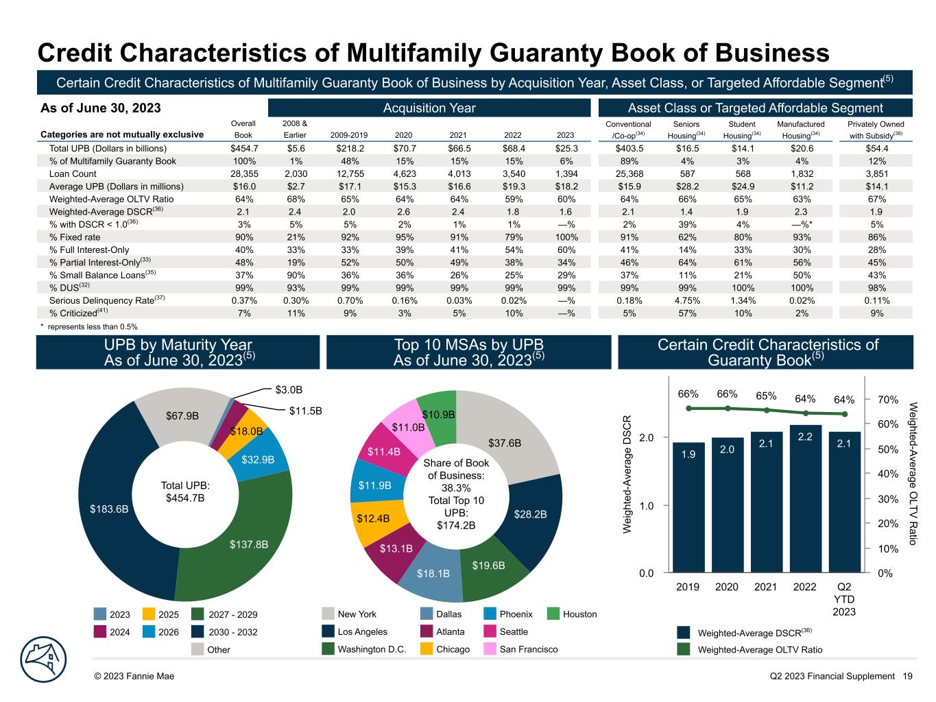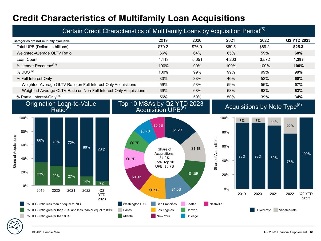 Q2 2023 Financial Supplement 18© 2023 Fannie Mae DRAFT S ha re o f A cq ui si tio ns 93% 93% 89% 78% 100% 7% 7% 11% 22% 2019 2020 2021 2022 Q2 YTD 2023 0% 20% 40% 60% 80% 100% Credit Characteristics of Multifamily Loan Acquisitions Certain Credit Characteristics of Multifamily Loans by Acquisition Period(5) Categories are not mutually exclusive 2019 2020 2021 2022 Q2 YTD 2023 Total UPB (Dollars in billions) $70.2 $76.0 $69.5 $69.2 $25.3 Weighted-Average OLTV Ratio 66% 64% 65% 59% 60% Loan Count 4,113 5,051 4,203 3,572 1,393 % Lender Recourse(31) 100% 99% 100% 100% 100% % DUS(32) 100% 99% 99% 99% 99% % Full Interest-Only 33% 38% 40% 53% 60% Weighted-Average OLTV Ratio on Full Interest-Only Acquisitions 59% 58% 59% 56% 57% Weighted-Average OLTV Ratio on Non-Full Interest-Only Acquisitions 69% 68% 68% 63% 63% % Partial Interest-Only(33) 56% 50% 50% 39% 34% S ha re o f A cq ui si tio ns 33% 29% 27% 14% 7% 66% 70% 72% 86% 93% 2019 2020 2021 2022 Q2 YTD 2023 0% 20% 40% 60% 80% 100% $1.2B $1.1B $1.0B $1.0B$0.9B $0.9B $0.7B $0.7B $0.7B $0.5B Share of Acquisitions: 34.2% Total Top 10 UPB: $8.7B Origination Loan-to-Value Ratio(5) Top 10 MSAs by Q2 YTD 2023 Acquisition UPB(5) Acquisitions by Note Type(5) % OLTV ratio less than or equal to 70% % OLTV ratio greater than 70% and less than or equal to 80% % OLTV ratio greater than 80% Fixed-rate Variable-rate Washington D.C. San Francisco Seattle Nashville Dallas Los Angeles Denver Atlanta New York Chicago