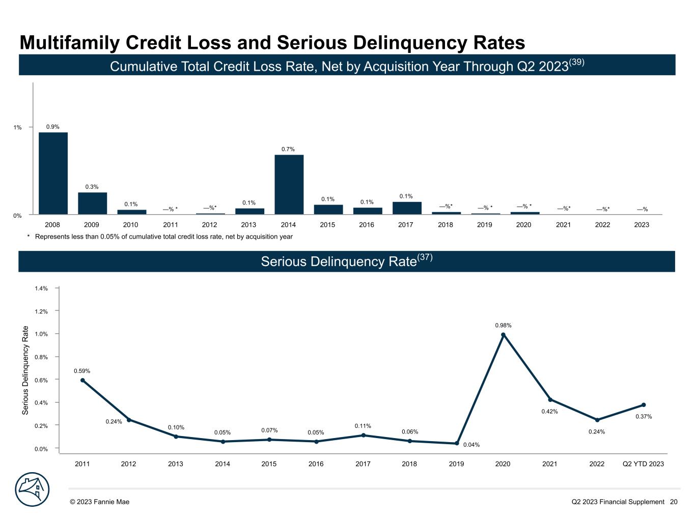 Q2 2023 Financial Supplement 20© 2023 Fannie Mae DRAFT S er io us D el in qu en cy R at e 0.59% 0.24% 0.10% 0.05% 0.07% 0.05% 0.11% 0.06% 0.04% 0.98% 0.42% 0.24% 0.37% 2011 2012 2013 2014 2015 2016 2017 2018 2019 2020 2021 2022 Q2 YTD 2023 0.0% 0.2% 0.4% 0.6% 0.8% 1.0% 1.2% 1.4% Multifamily Credit Loss and Serious Delinquency Rates 0.9% 0.3% 0.1% —% * —%* 0.1% 0.7% 0.1% 0.1% 0.1% —%* —% * —% * —%* —%* —% 2008 2009 2010 2011 2012 2013 2014 2015 2016 2017 2018 2019 2020 2021 2022 2023 0% 1% Serious Delinquency Rate(37) Cumulative Total Credit Loss Rate, Net by Acquisition Year Through Q2 2023(39) * Represents less than 0.05% of cumulative total credit loss rate, net by acquisition year