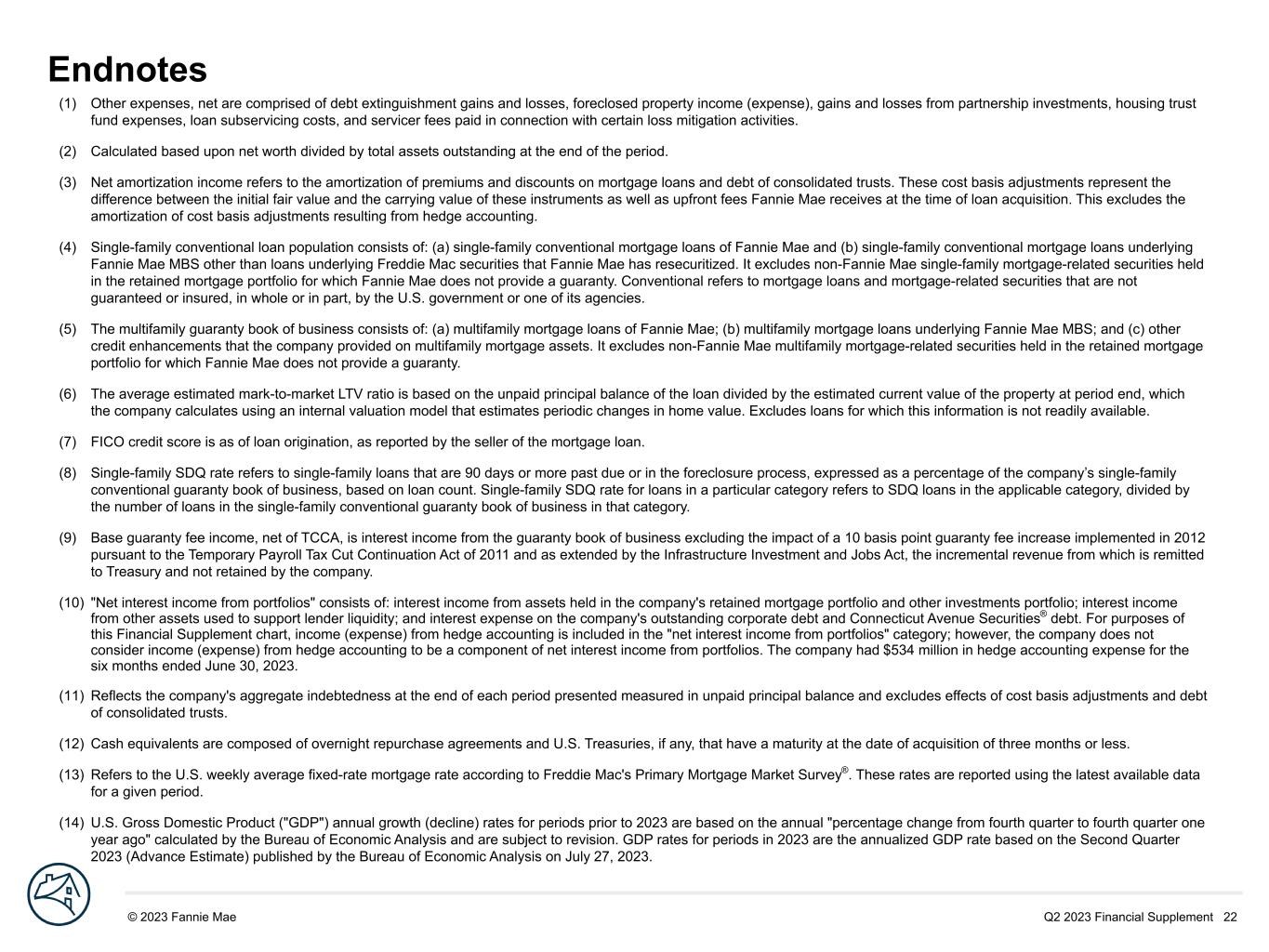 Q2 2023 Financial Supplement 22© 2023 Fannie Mae DRAFT (1) Other expenses, net are comprised of debt extinguishment gains and losses, foreclosed property income (expense), gains and losses from partnership investments, housing trust fund expenses, loan subservicing costs, and servicer fees paid in connection with certain loss mitigation activities. (2) Calculated based upon net worth divided by total assets outstanding at the end of the period. (3) Net amortization income refers to the amortization of premiums and discounts on mortgage loans and debt of consolidated trusts. These cost basis adjustments represent the difference between the initial fair value and the carrying value of these instruments as well as upfront fees Fannie Mae receives at the time of loan acquisition. This excludes the amortization of cost basis adjustments resulting from hedge accounting. (4) Single-family conventional loan population consists of: (a) single-family conventional mortgage loans of Fannie Mae and (b) single-family conventional mortgage loans underlying Fannie Mae MBS other than loans underlying Freddie Mac securities that Fannie Mae has resecuritized. It excludes non-Fannie Mae single-family mortgage-related securities held in the retained mortgage portfolio for which Fannie Mae does not provide a guaranty. Conventional refers to mortgage loans and mortgage-related securities that are not guaranteed or insured, in whole or in part, by the U.S. government or one of its agencies. (5) The multifamily guaranty book of business consists of: (a) multifamily mortgage loans of Fannie Mae; (b) multifamily mortgage loans underlying Fannie Mae MBS; and (c) other credit enhancements that the company provided on multifamily mortgage assets. It excludes non-Fannie Mae multifamily mortgage-related securities held in the retained mortgage portfolio for which Fannie Mae does not provide a guaranty. (6) The average estimated mark-to-market LTV ratio is based on the unpaid principal balance of the loan divided by the estimated current value of the property at period end, which the company calculates using an internal valuation model that estimates periodic changes in home value. Excludes loans for which this information is not readily available. (7) FICO credit score is as of loan origination, as reported by the seller of the mortgage loan. (8) Single-family SDQ rate refers to single-family loans that are 90 days or more past due or in the foreclosure process, expressed as a percentage of the company’s single-family conventional guaranty book of business, based on loan count. Single-family SDQ rate for loans in a particular category refers to SDQ loans in the applicable category, divided by the number of loans in the single-family conventional guaranty book of business in that category. (9) Base guaranty fee income, net of TCCA, is interest income from the guaranty book of business excluding the impact of a 10 basis point guaranty fee increase implemented in 2012 pursuant to the Temporary Payroll Tax Cut Continuation Act of 2011 and as extended by the Infrastructure Investment and Jobs Act, the incremental revenue from which is remitted to Treasury and not retained by the company. (10) "Net interest income from portfolios" consists of: interest income from assets held in the company's retained mortgage portfolio and other investments portfolio; interest income from other assets used to support lender liquidity; and interest expense on the company's outstanding corporate debt and Connecticut Avenue Securities® debt. For purposes of this Financial Supplement chart, income (expense) from hedge accounting is included in the "net interest income from portfolios" category; however, the company does not consider income (expense) from hedge accounting to be a component of net interest income from portfolios. The company had $534 million in hedge accounting expense for the six months ended June 30, 2023. (11) Reflects the company's aggregate indebtedness at the end of each period presented measured in unpaid principal balance and excludes effects of cost basis adjustments and debt of consolidated trusts. (12) Cash equivalents are composed of overnight repurchase agreements and U.S. Treasuries, if any, that have a maturity at the date of acquisition of three months or less. (13) Refers to the U.S. weekly average fixed-rate mortgage rate according to Freddie Mac's Primary Mortgage Market Survey®. These rates are reported using the latest available data for a given period. (14) U.S. Gross Domestic Product ("GDP") annual growth (decline) rates for periods prior to 2023 are based on the annual "percentage change from fourth quarter to fourth quarter one year ago" calculated by the Bureau of Economic Analysis and are subject to revision. GDP rates for periods in 2023 are the annualized GDP rate based on the Second Quarter 2023 (Advance Estimate) published by the Bureau of Economic Analysis on July 27, 2023. Endnotes