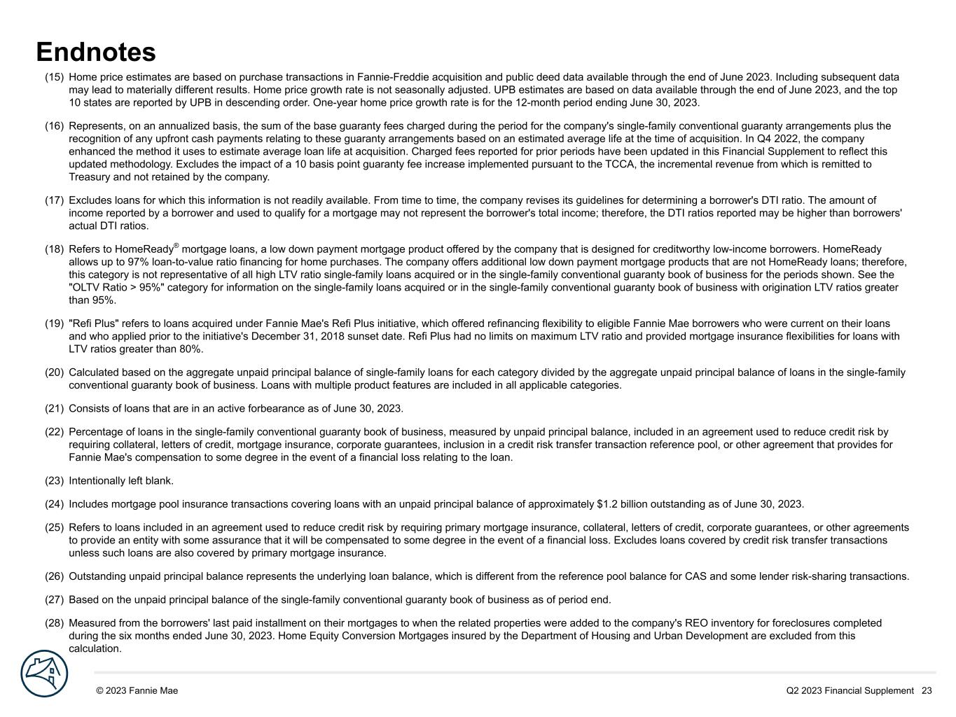 Q2 2023 Financial Supplement 23© 2023 Fannie Mae DRAFT Endnotes (15) Home price estimates are based on purchase transactions in Fannie-Freddie acquisition and public deed data available through the end of June 2023. Including subsequent data may lead to materially different results. Home price growth rate is not seasonally adjusted. UPB estimates are based on data available through the end of June 2023, and the top 10 states are reported by UPB in descending order. One-year home price growth rate is for the 12-month period ending June 30, 2023. (16) Represents, on an annualized basis, the sum of the base guaranty fees charged during the period for the company's single-family conventional guaranty arrangements plus the recognition of any upfront cash payments relating to these guaranty arrangements based on an estimated average life at the time of acquisition. In Q4 2022, the company enhanced the method it uses to estimate average loan life at acquisition. Charged fees reported for prior periods have been updated in this Financial Supplement to reflect this updated methodology. Excludes the impact of a 10 basis point guaranty fee increase implemented pursuant to the TCCA, the incremental revenue from which is remitted to Treasury and not retained by the company. (17) Excludes loans for which this information is not readily available. From time to time, the company revises its guidelines for determining a borrower's DTI ratio. The amount of income reported by a borrower and used to qualify for a mortgage may not represent the borrower's total income; therefore, the DTI ratios reported may be higher than borrowers' actual DTI ratios. (18) Refers to HomeReady® mortgage loans, a low down payment mortgage product offered by the company that is designed for creditworthy low-income borrowers. HomeReady allows up to 97% loan-to-value ratio financing for home purchases. The company offers additional low down payment mortgage products that are not HomeReady loans; therefore, this category is not representative of all high LTV ratio single-family loans acquired or in the single-family conventional guaranty book of business for the periods shown. See the "OLTV Ratio > 95%" category for information on the single-family loans acquired or in the single-family conventional guaranty book of business with origination LTV ratios greater than 95%. (19) "Refi Plus" refers to loans acquired under Fannie Mae's Refi Plus initiative, which offered refinancing flexibility to eligible Fannie Mae borrowers who were current on their loans and who applied prior to the initiative's December 31, 2018 sunset date. Refi Plus had no limits on maximum LTV ratio and provided mortgage insurance flexibilities for loans with LTV ratios greater than 80%. (20) Calculated based on the aggregate unpaid principal balance of single-family loans for each category divided by the aggregate unpaid principal balance of loans in the single-family conventional guaranty book of business. Loans with multiple product features are included in all applicable categories. (21) Consists of loans that are in an active forbearance as of June 30, 2023. (22) Percentage of loans in the single-family conventional guaranty book of business, measured by unpaid principal balance, included in an agreement used to reduce credit risk by requiring collateral, letters of credit, mortgage insurance, corporate guarantees, inclusion in a credit risk transfer transaction reference pool, or other agreement that provides for Fannie Mae's compensation to some degree in the event of a financial loss relating to the loan. (23) Intentionally left blank. (24) Includes mortgage pool insurance transactions covering loans with an unpaid principal balance of approximately $1.2 billion outstanding as of June 30, 2023. (25) Refers to loans included in an agreement used to reduce credit risk by requiring primary mortgage insurance, collateral, letters of credit, corporate guarantees, or other agreements to provide an entity with some assurance that it will be compensated to some degree in the event of a financial loss. Excludes loans covered by credit risk transfer transactions unless such loans are also covered by primary mortgage insurance. (26) Outstanding unpaid principal balance represents the underlying loan balance, which is different from the reference pool balance for CAS and some lender risk-sharing transactions. (27) Based on the unpaid principal balance of the single-family conventional guaranty book of business as of period end. (28) Measured from the borrowers' last paid installment on their mortgages to when the related properties were added to the company's REO inventory for foreclosures completed during the six months ended June 30, 2023. Home Equity Conversion Mortgages insured by the Department of Housing and Urban Development are excluded from this calculation.