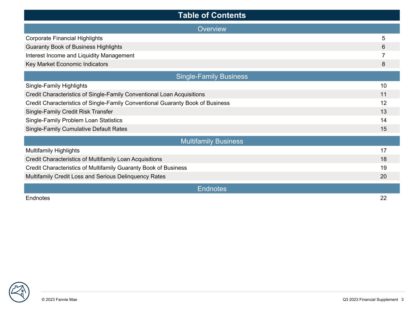 Q3 2023 Financial Supplement 3© 2023 Fannie Mae DRAFTTable of Contents Overview Corporate Financial Highlights 5 Guaranty Book of Business Highlights 6 Interest Income and Liquidity Management 7 Key Market Economic Indicators 8 Single-Family Business Single-Family Highlights 10 Credit Characteristics of Single-Family Conventional Loan Acquisitions 11 Credit Characteristics of Single-Family Conventional Guaranty Book of Business 12 Single-Family Credit Risk Transfer 13 Single-Family Problem Loan Statistics 14 Single-Family Cumulative Default Rates 15 Multifamily Business Multifamily Highlights 17 Credit Characteristics of Multifamily Loan Acquisitions 18 Credit Characteristics of Multifamily Guaranty Book of Business 19 Multifamily Credit Loss and Serious Delinquency Rates 20 Endnotes Endnotes 22