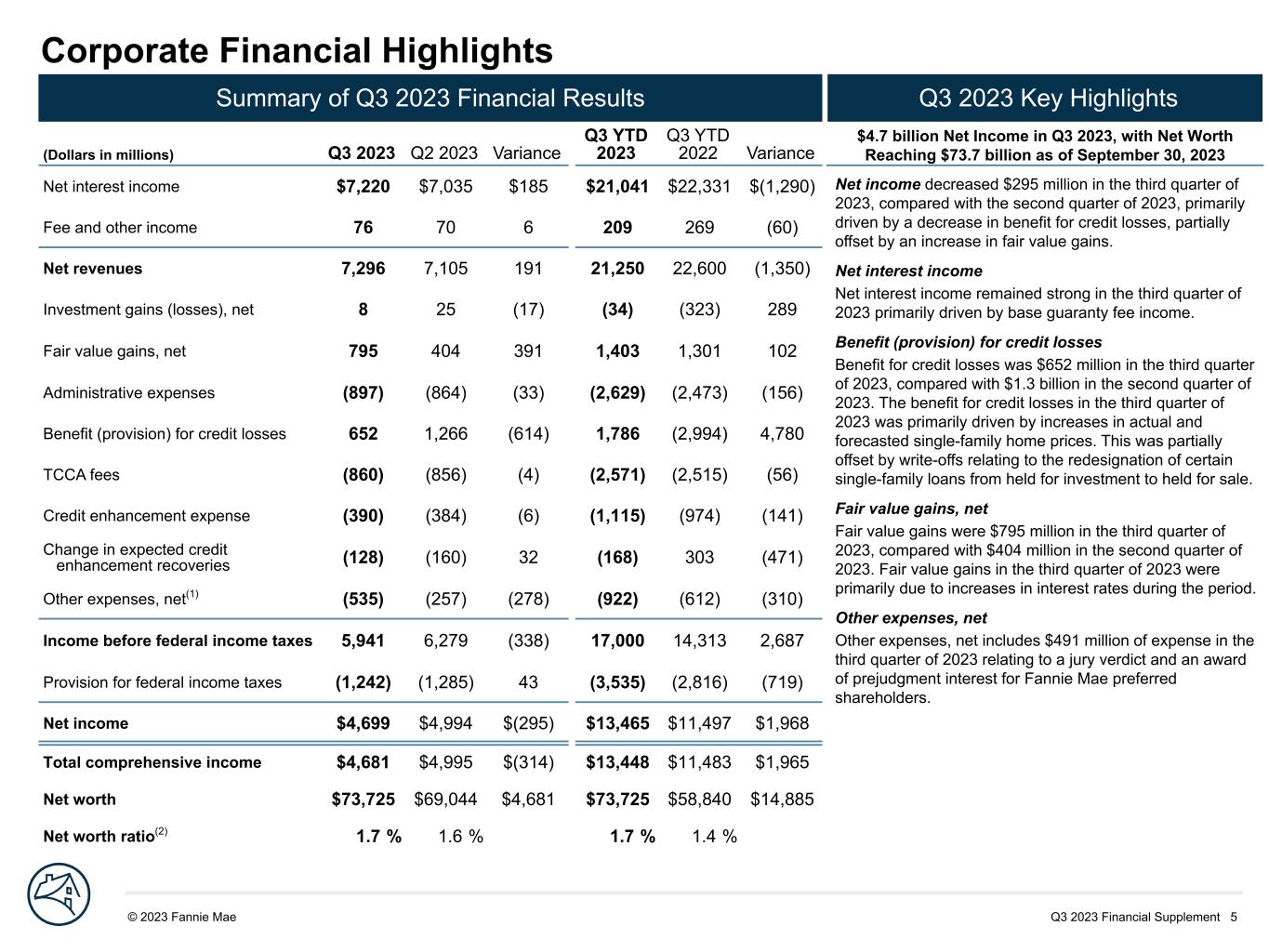 Q3 2023 Financial Supplement 5© 2023 Fannie Mae DRAFT Net income decreased $295 million in the third quarter of 2023, compared with the second quarter of 2023, primarily driven by a decrease in benefit for credit losses, partially offset by an increase in fair value gains. Net interest income Net interest income remained strong in the third quarter of 2023 primarily driven by base guaranty fee income. Benefit (provision) for credit losses Benefit for credit losses was $652 million in the third quarter of 2023, compared with $1.3 billion in the second quarter of 2023. The benefit for credit losses in the third quarter of 2023 was primarily driven by increases in actual and forecasted single-family home prices. This was partially offset by write-offs relating to the redesignation of certain single-family loans from held for investment to held for sale. Fair value gains, net Fair value gains were $795 million in the third quarter of 2023, compared with $404 million in the second quarter of 2023. Fair value gains in the third quarter of 2023 were primarily due to increases in interest rates during the period. Other expenses, net Other expenses, net includes $491 million of expense in the third quarter of 2023 relating to a jury verdict and an award of prejudgment interest for Fannie Mae preferred shareholders. Corporate Financial Highlights (Dollars in millions) Q3 2023 Q2 2023 Variance Q3 YTD 2023 Q3 YTD 2022 Variance Net interest income $7,220 $7,035 $185 $21,041 $22,331 $(1,290) Fee and other income 76 70 6 209 269 (60) Net revenues 7,296 7,105 191 21,250 22,600 (1,350) Investment gains (losses), net 8 25 (17) (34) (323) 289 Fair value gains, net 795 404 391 1,403 1,301 102 Administrative expenses (897) (864) (33) (2,629) (2,473) (156) Benefit (provision) for credit losses 652 1,266 (614) 1,786 (2,994) 4,780 TCCA fees (860) (856) (4) (2,571) (2,515) (56) Credit enhancement expense (390) (384) (6) (1,115) (974) (141) Change in expected credit enhancement recoveries (128) (160) 32 (168) 303 (471) Other expenses, net(1) (535) (257) (278) (922) (612) (310) Income before federal income taxes 5,941 6,279 (338) 17,000 14,313 2,687 Provision for federal income taxes (1,242) (1,285) 43 (3,535) (2,816) (719) Net income $4,699 $4,994 $(295) $13,465 $11,497 $1,968 Total comprehensive income $4,681 $4,995 $(314) $13,448 $11,483 $1,965 Net worth $73,725 $69,044 $4,681 $73,725 $58,840 $14,885 Net worth ratio(2) 1.7 % 1.6 % 1.7 % 1.4 % Summary of Q3 2023 Financial Results Q3 2023 Key Highlights $4.7 billion Net Income in Q3 2023, with Net Worth Reaching $73.7 billion as of September 30, 2023