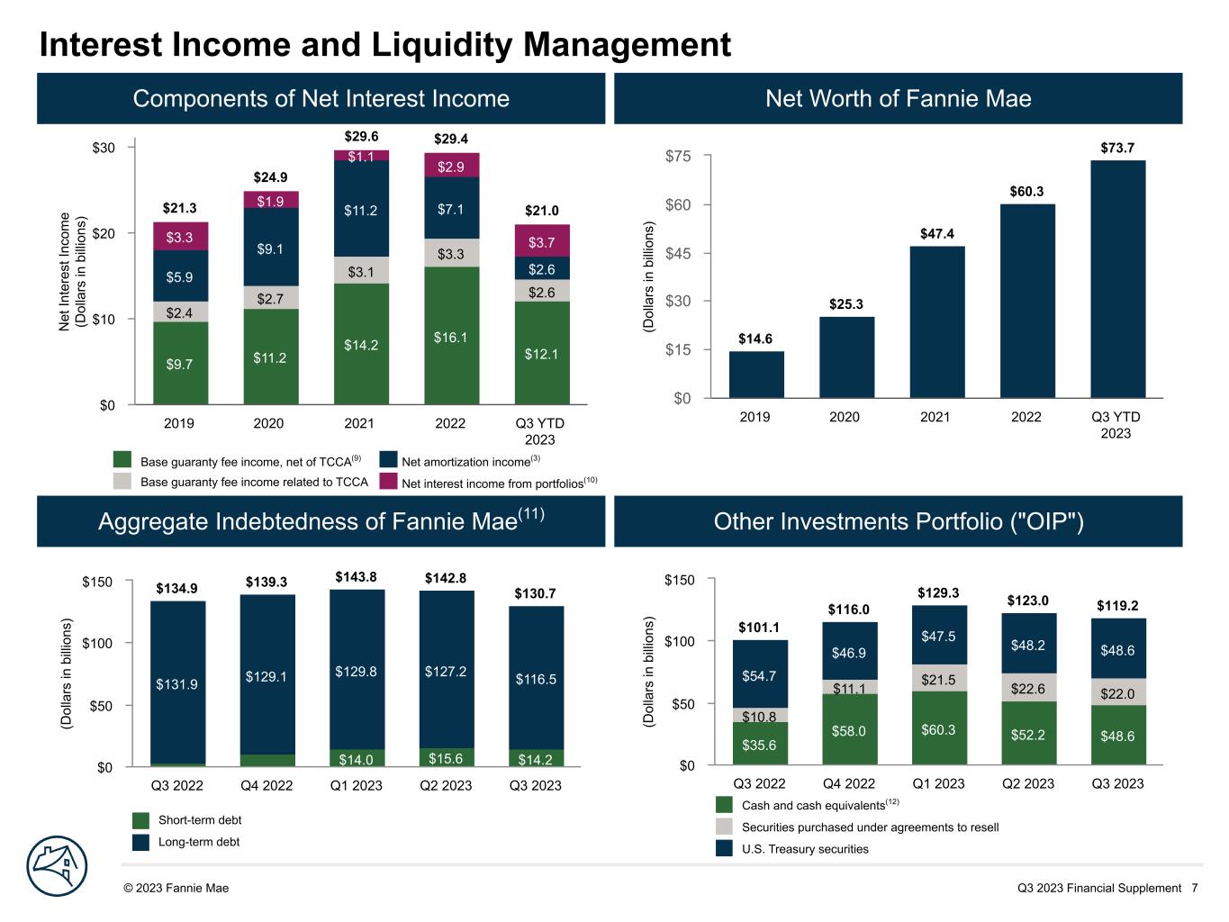 Q3 2023 Financial Supplement 7© 2023 Fannie Mae DRAFTInterest Income and Liquidity Management Components of Net Interest Income Net Worth of Fannie Mae Aggregate Indebtedness of Fannie Mae(11) Other Investments Portfolio ("OIP") N et In te re st In co m e (D ol la rs in b illi on s) $21.3 $24.9 $29.6 $29.4 $21.0 $9.7 $11.2 $14.2 $16.1 $12.1 $2.4 $2.7 $3.1 $3.3 $2.6 $5.9 $9.1 $11.2 $7.1 $2.6 $3.3 $1.9 $1.1 $2.9 $3.7 2019 2020 2021 2022 Q3 YTD 2023 $0 $10 $20 $30 Base guaranty fee income, net of TCCA(9) Net amortization income(3) Base guaranty fee income related to TCCA Net interest income from portfolios(10) (D ol la rs in b illi on s) $14.0 $15.6 $14.2 $131.9 $129.1 $129.8 $127.2 $116.5 $134.9 $139.3 $143.8 $142.8 $130.7 Q3 2022 Q4 2022 Q1 2023 Q2 2023 Q3 2023 $0 $50 $100 $150 (D ol la rs in b illi on s) $35.6 $58.0 $60.3 $52.2 $48.6 $10.8 $11.1 $21.5 $22.6 $22.0 $54.7 $46.9 $47.5 $48.2 $48.6 $101.1 $116.0 $129.3 $123.0 $119.2 Q3 2022 Q4 2022 Q1 2023 Q2 2023 Q3 2023 $0 $50 $100 $150 Cash and cash equivalents(12) Securities purchased under agreements to resell U.S. Treasury securities Short-term debt Long-term debt (D ol la rs in b illi on s) $14.6 $25.3 $47.4 $60.3 $73.7 2019 2020 2021 2022 Q3 YTD 2023 $0 $15 $30 $45 $60 $75