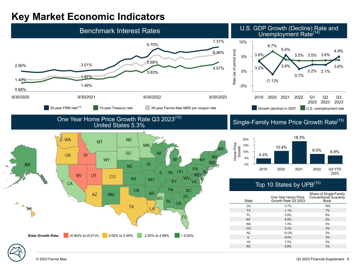 Q3 2023 Financial Supplement 8© 2023 Fannie Mae DRAFT R at e (a s of p er io d en d) 3.6% 6.7% 3.9% 3.5% 3.5% 3.6% 3.8%3.2% (1.1)% 5.4% 0.7% 2.2% 2.1% 4.9% 2019 2020 2021 2022 Q1 2023 Q2 2023 Q3 2023 -5% 0% 5% 10% Key Market Economic Indicators 0.68% 1.49% 3.83% 4.57% 1.40% 1.97% 5.68% 6.36% 2.90% 3.01% 6.70% 7.31% 9/30/2020 9/30/2021 9/30/2022 9/30/2023 Top 10 States by UPB(15) State One Year Home Price Growth Rate Q3 2023 Share of Single-Family Conventional Guaranty Book CA 3.7% 19% TX 1.1% 7% FL 3.9% 6% NY 6.5% 5% WA 1.3% 4% CO 2.2% 3% NJ 10.3% 3% IL 8.0% 3% VA 7.5% 3% NC 5.8% 3% H om e P ric e G ro w th 4.3% 10.4% 18.3% 8.0% 6.9% 2019 2020 2021 2022 Q3 YTD 2023 0% 5% 10% 15% 20% Benchmark Interest Rates U.S. GDP Growth (Decline) Rate and Unemployment Rate(14) One Year Home Price Growth Rate Q3 2023(15) United States 5.3% Single-Family Home Price Growth Rate(15) Growth (decline) in GDP U.S. unemployment rate30-year FRM rate(13) 10-year Treasury rate 30-year Fannie Mae MBS par coupon rate State Growth Rate: (4.99)% to (0.01)% 0.00% to 2.49% 2.50% to 4.99% > 5.00%