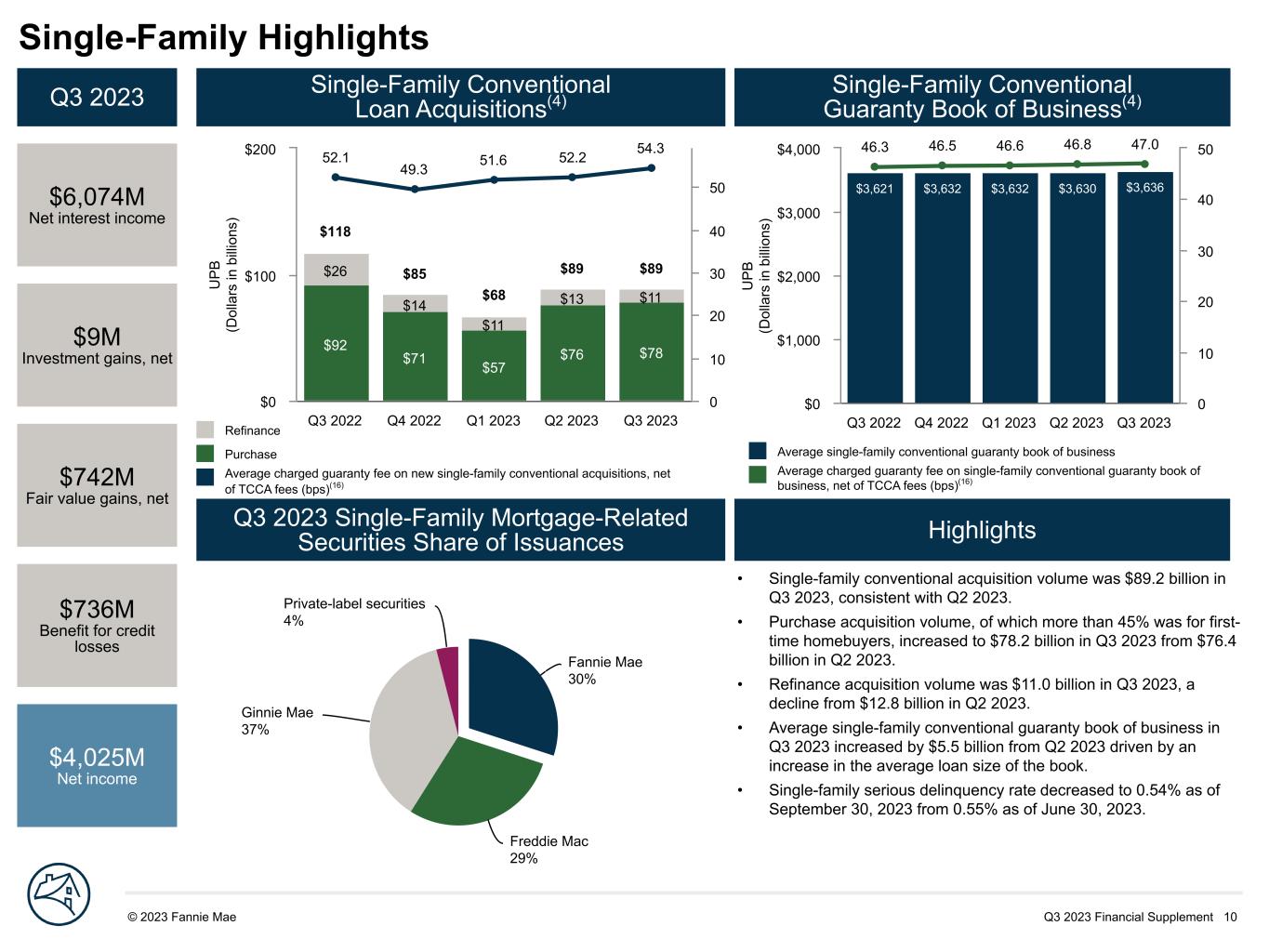 Q3 2023 Financial Supplement 10© 2023 Fannie Mae DRAFT Fannie Mae 30% Freddie Mac 29% Ginnie Mae 37% Private-label securities 4% U P B (D ol la rs in b illi on s) $3,621 $3,632 $3,632 $3,630 $3,636 46.3 46.5 46.6 46.8 47.0 Q3 2022 Q4 2022 Q1 2023 Q2 2023 Q3 2023 $0 $1,000 $2,000 $3,000 $4,000 0 10 20 30 40 50 U P B (D ol la rs in b illi on s) $92 $71 $57 $76 $78 $26 $14 $11 $13 $11 52.1 49.3 51.6 52.2 54.3 $118 $85 $68 $89 $89 Q3 2022 Q4 2022 Q1 2023 Q2 2023 Q3 2023 $0 $100 $200 0 10 20 30 40 50 Single-Family Highlights Q3 2023 $6,074M Net interest income $9M Investment gains, net $742M Fair value gains, net $736M Benefit for credit losses $4,025M Net income Single-Family Conventional Loan Acquisitions(4) Single-Family Conventional Guaranty Book of Business(4) Q3 2023 Single-Family Mortgage-Related Securities Share of Issuances Highlights Refinance Purchase Average charged guaranty fee on new single-family conventional acquisitions, net of TCCA fees (bps)(16) Average single-family conventional guaranty book of business Average charged guaranty fee on single-family conventional guaranty book of business, net of TCCA fees (bps)(16) • Single-family conventional acquisition volume was $89.2 billion in Q3 2023, consistent with Q2 2023. • Purchase acquisition volume, of which more than 45% was for first- time homebuyers, increased to $78.2 billion in Q3 2023 from $76.4 billion in Q2 2023. • Refinance acquisition volume was $11.0 billion in Q3 2023, a decline from $12.8 billion in Q2 2023. • Average single-family conventional guaranty book of business in Q3 2023 increased by $5.5 billion from Q2 2023 driven by an increase in the average loan size of the book. • Single-family serious delinquency rate decreased to 0.54% as of September 30, 2023 from 0.55% as of June 30, 2023.