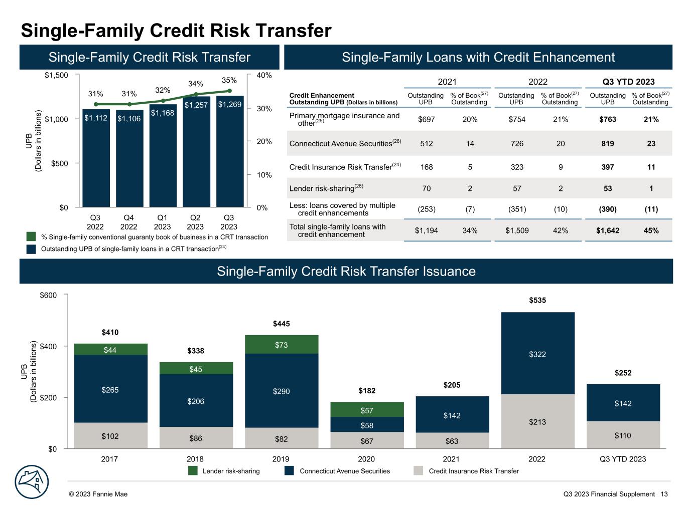 Q3 2023 Financial Supplement 13© 2023 Fannie Mae DRAFT U P B (D ol la rs in b illi on s) $102 $86 $82 $67 $63 $213 $110 $265 $206 $290 $58 $142 $322 $142 $44 $45 $73 $57 $410 $338 $445 $182 $205 $535 $252 2017 2018 2019 2020 2021 2022 Q3 YTD 2023 $0 $200 $400 $600 Single-Family Credit Risk Transfer U P B (D ol la rs in b illi on s) $1,112 $1,106 $1,168 $1,257 $1,269 31% 31% 32% 34% 35% Q3 2022 Q4 2022 Q1 2023 Q2 2023 Q3 2023 $0 $500 $1,000 $1,500 0% 10% 20% 30% 40% 2021 2022 Q3 YTD 2023 Credit Enhancement Outstanding UPB (Dollars in billions) Outstanding UPB % of Book(27) Outstanding Outstanding UPB % of Book(27) Outstanding Outstanding UPB % of Book(27) Outstanding Primary mortgage insurance and other(25) $697 20% $754 21% $763 21% Connecticut Avenue Securities(26) 512 14 726 20 819 23 Credit Insurance Risk Transfer(24) 168 5 323 9 397 11 Lender risk-sharing(26) 70 2 57 2 53 1 Less: loans covered by multiple credit enhancements (253) (7) (351) (10) (390) (11) Total single-family loans with credit enhancement $1,194 34% $1,509 42% $1,642 45% Single-Family Credit Risk Transfer Issuance Single-Family Credit Risk Transfer Single-Family Loans with Credit Enhancement % Single-family conventional guaranty book of business in a CRT transaction Outstanding UPB of single-family loans in a CRT transaction(24) Lender risk-sharing Connecticut Avenue Securities Credit Insurance Risk Transfer