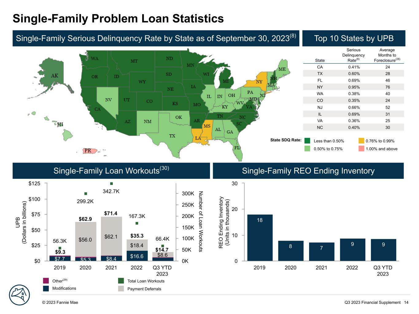 Q3 2023 Financial Supplement 14© 2023 Fannie Mae DRAFT U P B (D ol la rs in b illi on s) N um ber of Loan W orkouts $7.7 $5.3 $8.4 $16.6 $56.0 $62.1 $18.4 $8.6 56.3K 299.2K 342.7K 167.3K 66.4K 2019 2020 2021 2022 Q3 YTD 2023 $0 $25 $50 $75 $100 $125 0K 50K 100K 150K 200K 250K 300K R E O E nd in g In ve nt or y (U ni ts in th ou sa nd s) 18 8 7 9 9 2019 2020 2021 2022 Q3 YTD 2023 0 10 20 30 Single-Family Problem Loan Statistics State Serious Delinquency Rate(8) Average Months to Foreclosure(28) CA 0.41% 24 TX 0.60% 28 FL 0.69% 46 NY 0.95% 76 WA 0.38% 40 CO 0.35% 24 NJ 0.66% 52 IL 0.69% 31 VA 0.36% 25 NC 0.40% 30 Single-Family Serious Delinquency Rate by State as of September 30, 2023(8) Top 10 States by UPB Single-Family Loan Workouts(30) Single-Family REO Ending Inventory Less than 0.50% 0.76% to 0.99% 0.50% to 0.75% 1.00% and above Other(29) Total Loan Workouts Modifications Payment Deferrals $71.4 $62.9 $9.3 $35.3 $14.7 State SDQ Rate: