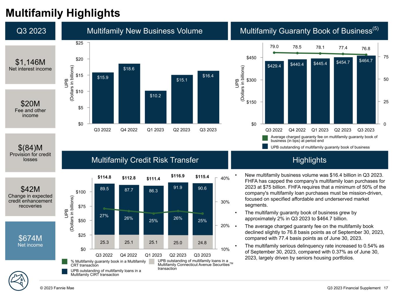 Q3 2023 Financial Supplement 17© 2023 Fannie Mae DRAFT U P B (D ol la rs in b illi on s) $429.4 $440.4 $445.4 $454.7 $464.7 79.0 78.5 78.1 77.4 76.8 Q3 2022 Q4 2022 Q1 2023 Q2 2023 Q3 2023 $0 $150 $300 $450 0 25 50 75 U P B (D ol la rs in b illi on s) $15.9 $18.6 $10.2 $15.1 $16.4 Q3 2022 Q4 2022 Q1 2023 Q2 2023 Q3 2023 $0 $5 $10 $15 $20 $25 Multifamily Highlights Q3 2023 $1,146M Net interest income $20M Fee and other income $(84)M Provision for credit losses $42M Change in expected credit enhancement recoveries $674M Net income Multifamily New Business Volume Multifamily Guaranty Book of Business(5) Multifamily Credit Risk Transfer Highlights U P B (D ol la rs in b illi on s) 25.3 25.1 25.1 25.0 24.8 89.5 87.7 86.3 91.9 90.6 27% 26% 25% 26% 25% $114.8 $112.8 $111.4 $116.9 $115.4 Q3 2022 Q4 2022 Q1 2023 Q2 2023 Q3 2023 $0 $25 $50 $75 $100 10% 20% 30% 40% Average charged guaranty fee on multifamily guaranty book of business (in bps) at period end UPB outstanding of multifamily guaranty book of business UPB outstanding of multifamily loans in a Multifamily Connecticut Avenue SecuritiesTM transaction % Multifamily guaranty book in a Multifamily CRT transaction UPB outstanding of multifamily loans in a Multifamily CIRT transaction • New multifamily business volume was $16.4 billion in Q3 2023. FHFA has capped the company's multifamily loan purchases for 2023 at $75 billion. FHFA requires that a minimum of 50% of the company's multifamily loan purchases must be mission-driven, focused on specified affordable and underserved market segments. • The multifamily guaranty book of business grew by approximately 2% in Q3 2023 to $464.7 billion. • The average charged guaranty fee on the multifamily book declined slightly to 76.8 basis points as of September 30, 2023, compared with 77.4 basis points as of June 30, 2023. • The multifamily serious delinquency rate increased to 0.54% as of September 30, 2023, compared with 0.37% as of June 30, 2023, largely driven by seniors housing portfolios.