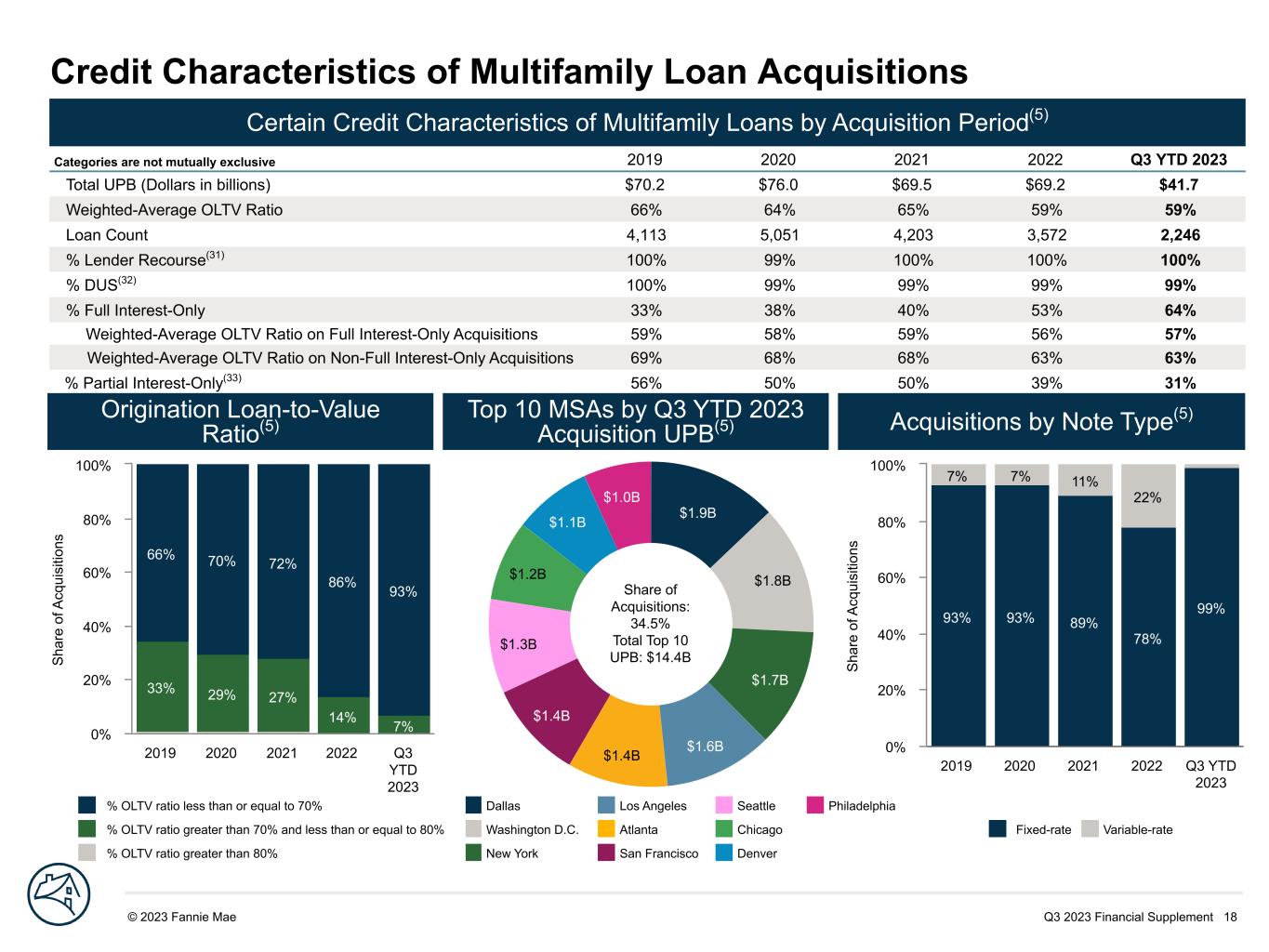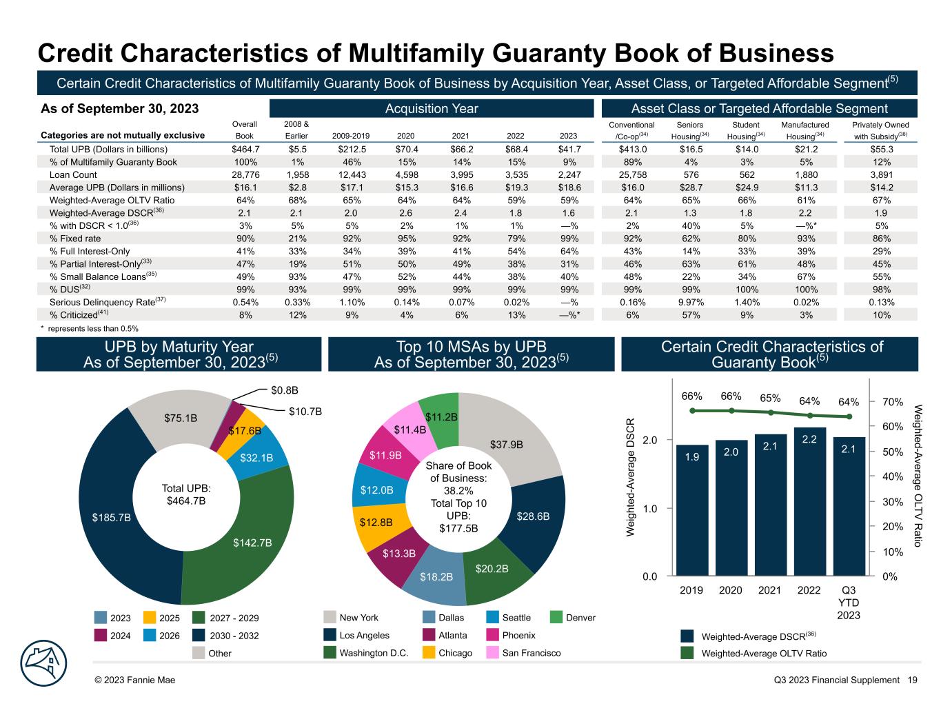 Q3 2023 Financial Supplement 18© 2023 Fannie Mae DRAFT S ha re o f A cq ui si tio ns 93% 93% 89% 78% 99% 7% 7% 11% 22% 2019 2020 2021 2022 Q3 YTD 2023 0% 20% 40% 60% 80% 100% Credit Characteristics of Multifamily Loan Acquisitions Certain Credit Characteristics of Multifamily Loans by Acquisition Period(5) Categories are not mutually exclusive 2019 2020 2021 2022 Q3 YTD 2023 Total UPB (Dollars in billions) $70.2 $76.0 $69.5 $69.2 $41.7 Weighted-Average OLTV Ratio 66% 64% 65% 59% 59% Loan Count 4,113 5,051 4,203 3,572 2,246 % Lender Recourse(31) 100% 99% 100% 100% 100% % DUS(32) 100% 99% 99% 99% 99% % Full Interest-Only 33% 38% 40% 53% 64% Weighted-Average OLTV Ratio on Full Interest-Only Acquisitions 59% 58% 59% 56% 57% Weighted-Average OLTV Ratio on Non-Full Interest-Only Acquisitions 69% 68% 68% 63% 63% % Partial Interest-Only(33) 56% 50% 50% 39% 31% S ha re o f A cq ui si tio ns 33% 29% 27% 14% 7% 66% 70% 72% 86% 93% 2019 2020 2021 2022 Q3 YTD 2023 0% 20% 40% 60% 80% 100% $1.9B $1.8B $1.7B $1.6B$1.4B $1.4B $1.3B $1.2B $1.1B $1.0B Share of Acquisitions: 34.5% Total Top 10 UPB: $14.4B Origination Loan-to-Value Ratio(5) Top 10 MSAs by Q3 YTD 2023 Acquisition UPB(5) Acquisitions by Note Type(5) % OLTV ratio less than or equal to 70% % OLTV ratio greater than 70% and less than or equal to 80% % OLTV ratio greater than 80% Fixed-rate Variable-rate Dallas Los Angeles Seattle Philadelphia Washington D.C. Atlanta Chicago New York San Francisco Denver