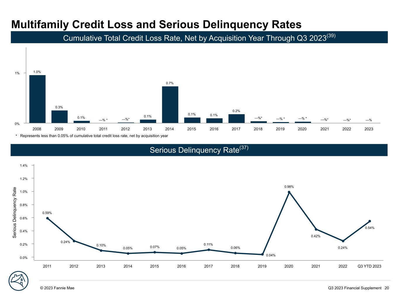 Q3 2023 Financial Supplement 20© 2023 Fannie Mae DRAFT S er io us D el in qu en cy R at e 0.59% 0.24% 0.10% 0.05% 0.07% 0.05% 0.11% 0.06% 0.04% 0.98% 0.42% 0.24% 0.54% 2011 2012 2013 2014 2015 2016 2017 2018 2019 2020 2021 2022 Q3 YTD 2023 0.0% 0.2% 0.4% 0.6% 0.8% 1.0% 1.2% 1.4% Multifamily Credit Loss and Serious Delinquency Rates 1.0% 0.3% 0.1% —% * —%* 0.1% 0.7% 0.1% 0.1% 0.2% —%* —% * —% * —%* —%* —% 2008 2009 2010 2011 2012 2013 2014 2015 2016 2017 2018 2019 2020 2021 2022 2023 0% 1% Serious Delinquency Rate(37) Cumulative Total Credit Loss Rate, Net by Acquisition Year Through Q3 2023(39) * Represents less than 0.05% of cumulative total credit loss rate, net by acquisition year