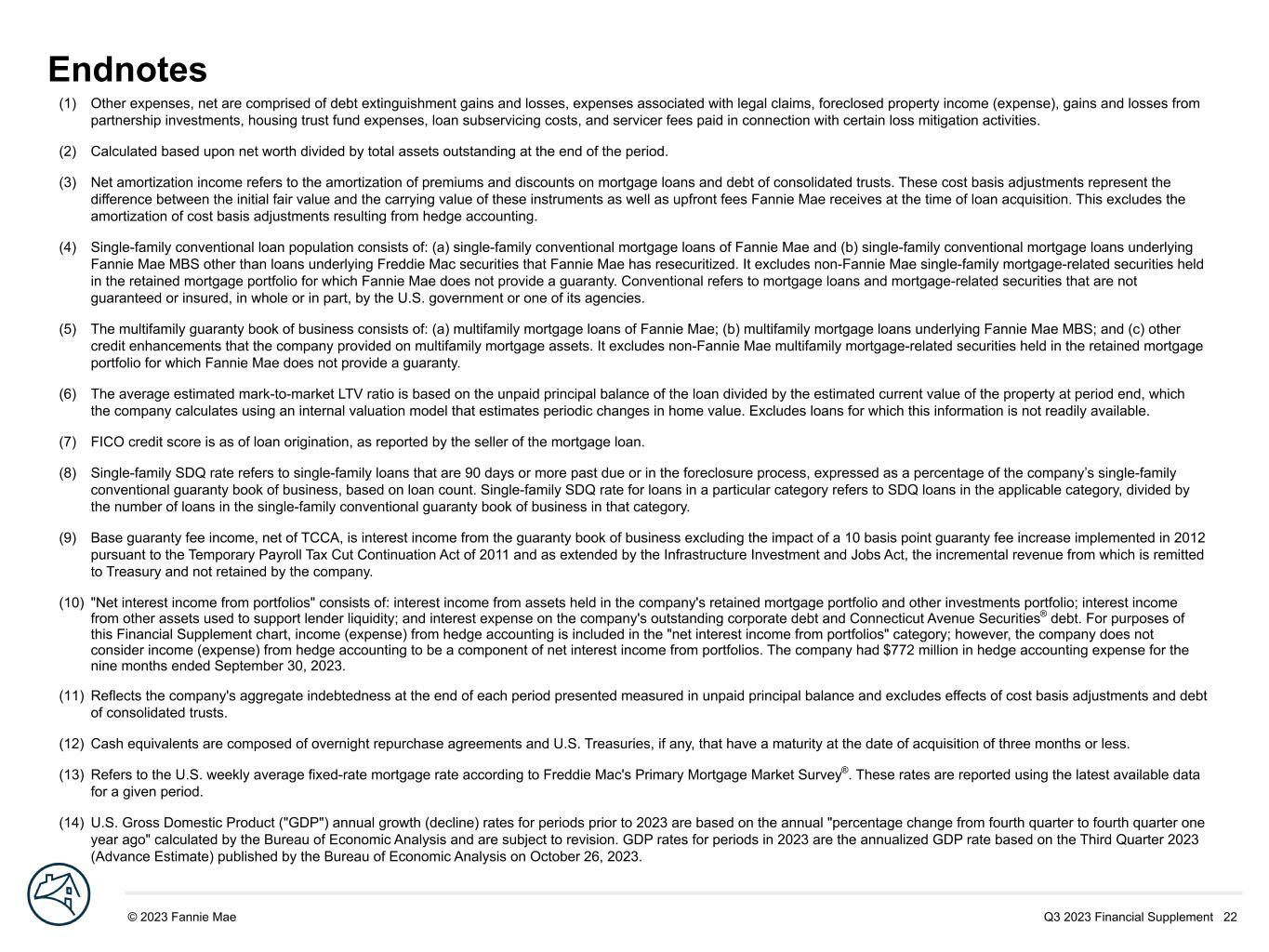 Q3 2023 Financial Supplement 22© 2023 Fannie Mae DRAFT (1) Other expenses, net are comprised of debt extinguishment gains and losses, expenses associated with legal claims, foreclosed property income (expense), gains and losses from partnership investments, housing trust fund expenses, loan subservicing costs, and servicer fees paid in connection with certain loss mitigation activities. (2) Calculated based upon net worth divided by total assets outstanding at the end of the period. (3) Net amortization income refers to the amortization of premiums and discounts on mortgage loans and debt of consolidated trusts. These cost basis adjustments represent the difference between the initial fair value and the carrying value of these instruments as well as upfront fees Fannie Mae receives at the time of loan acquisition. This excludes the amortization of cost basis adjustments resulting from hedge accounting. (4) Single-family conventional loan population consists of: (a) single-family conventional mortgage loans of Fannie Mae and (b) single-family conventional mortgage loans underlying Fannie Mae MBS other than loans underlying Freddie Mac securities that Fannie Mae has resecuritized. It excludes non-Fannie Mae single-family mortgage-related securities held in the retained mortgage portfolio for which Fannie Mae does not provide a guaranty. Conventional refers to mortgage loans and mortgage-related securities that are not guaranteed or insured, in whole or in part, by the U.S. government or one of its agencies. (5) The multifamily guaranty book of business consists of: (a) multifamily mortgage loans of Fannie Mae; (b) multifamily mortgage loans underlying Fannie Mae MBS; and (c) other credit enhancements that the company provided on multifamily mortgage assets. It excludes non-Fannie Mae multifamily mortgage-related securities held in the retained mortgage portfolio for which Fannie Mae does not provide a guaranty. (6) The average estimated mark-to-market LTV ratio is based on the unpaid principal balance of the loan divided by the estimated current value of the property at period end, which the company calculates using an internal valuation model that estimates periodic changes in home value. Excludes loans for which this information is not readily available. (7) FICO credit score is as of loan origination, as reported by the seller of the mortgage loan. (8) Single-family SDQ rate refers to single-family loans that are 90 days or more past due or in the foreclosure process, expressed as a percentage of the company’s single-family conventional guaranty book of business, based on loan count. Single-family SDQ rate for loans in a particular category refers to SDQ loans in the applicable category, divided by the number of loans in the single-family conventional guaranty book of business in that category. (9) Base guaranty fee income, net of TCCA, is interest income from the guaranty book of business excluding the impact of a 10 basis point guaranty fee increase implemented in 2012 pursuant to the Temporary Payroll Tax Cut Continuation Act of 2011 and as extended by the Infrastructure Investment and Jobs Act, the incremental revenue from which is remitted to Treasury and not retained by the company. (10) "Net interest income from portfolios" consists of: interest income from assets held in the company's retained mortgage portfolio and other investments portfolio; interest income from other assets used to support lender liquidity; and interest expense on the company's outstanding corporate debt and Connecticut Avenue Securities® debt. For purposes of this Financial Supplement chart, income (expense) from hedge accounting is included in the "net interest income from portfolios" category; however, the company does not consider income (expense) from hedge accounting to be a component of net interest income from portfolios. The company had $772 million in hedge accounting expense for the nine months ended September 30, 2023. (11) Reflects the company's aggregate indebtedness at the end of each period presented measured in unpaid principal balance and excludes effects of cost basis adjustments and debt of consolidated trusts. (12) Cash equivalents are composed of overnight repurchase agreements and U.S. Treasuries, if any, that have a maturity at the date of acquisition of three months or less. (13) Refers to the U.S. weekly average fixed-rate mortgage rate according to Freddie Mac's Primary Mortgage Market Survey®. These rates are reported using the latest available data for a given period. (14) U.S. Gross Domestic Product ("GDP") annual growth (decline) rates for periods prior to 2023 are based on the annual "percentage change from fourth quarter to fourth quarter one year ago" calculated by the Bureau of Economic Analysis and are subject to revision. GDP rates for periods in 2023 are the annualized GDP rate based on the Third Quarter 2023 (Advance Estimate) published by the Bureau of Economic Analysis on October 26, 2023. Endnotes