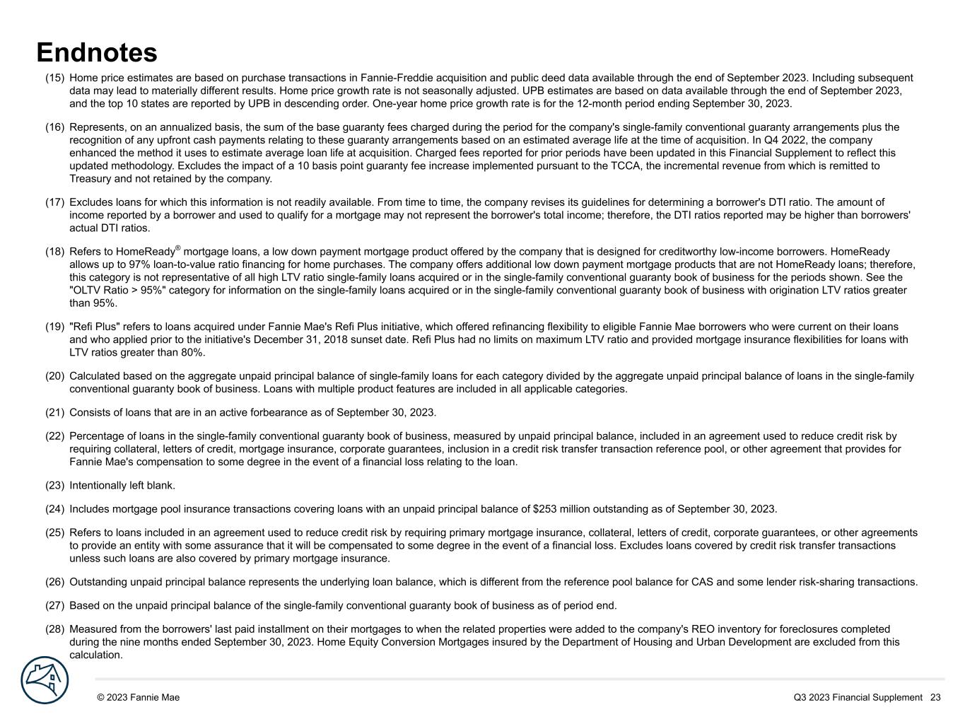 Q3 2023 Financial Supplement 23© 2023 Fannie Mae DRAFT Endnotes (15) Home price estimates are based on purchase transactions in Fannie-Freddie acquisition and public deed data available through the end of September 2023. Including subsequent data may lead to materially different results. Home price growth rate is not seasonally adjusted. UPB estimates are based on data available through the end of September 2023, and the top 10 states are reported by UPB in descending order. One-year home price growth rate is for the 12-month period ending September 30, 2023. (16) Represents, on an annualized basis, the sum of the base guaranty fees charged during the period for the company's single-family conventional guaranty arrangements plus the recognition of any upfront cash payments relating to these guaranty arrangements based on an estimated average life at the time of acquisition. In Q4 2022, the company enhanced the method it uses to estimate average loan life at acquisition. Charged fees reported for prior periods have been updated in this Financial Supplement to reflect this updated methodology. Excludes the impact of a 10 basis point guaranty fee increase implemented pursuant to the TCCA, the incremental revenue from which is remitted to Treasury and not retained by the company. (17) Excludes loans for which this information is not readily available. From time to time, the company revises its guidelines for determining a borrower's DTI ratio. The amount of income reported by a borrower and used to qualify for a mortgage may not represent the borrower's total income; therefore, the DTI ratios reported may be higher than borrowers' actual DTI ratios. (18) Refers to HomeReady® mortgage loans, a low down payment mortgage product offered by the company that is designed for creditworthy low-income borrowers. HomeReady allows up to 97% loan-to-value ratio financing for home purchases. The company offers additional low down payment mortgage products that are not HomeReady loans; therefore, this category is not representative of all high LTV ratio single-family loans acquired or in the single-family conventional guaranty book of business for the periods shown. See the "OLTV Ratio > 95%" category for information on the single-family loans acquired or in the single-family conventional guaranty book of business with origination LTV ratios greater than 95%. (19) "Refi Plus" refers to loans acquired under Fannie Mae's Refi Plus initiative, which offered refinancing flexibility to eligible Fannie Mae borrowers who were current on their loans and who applied prior to the initiative's December 31, 2018 sunset date. Refi Plus had no limits on maximum LTV ratio and provided mortgage insurance flexibilities for loans with LTV ratios greater than 80%. (20) Calculated based on the aggregate unpaid principal balance of single-family loans for each category divided by the aggregate unpaid principal balance of loans in the single-family conventional guaranty book of business. Loans with multiple product features are included in all applicable categories. (21) Consists of loans that are in an active forbearance as of September 30, 2023. (22) Percentage of loans in the single-family conventional guaranty book of business, measured by unpaid principal balance, included in an agreement used to reduce credit risk by requiring collateral, letters of credit, mortgage insurance, corporate guarantees, inclusion in a credit risk transfer transaction reference pool, or other agreement that provides for Fannie Mae's compensation to some degree in the event of a financial loss relating to the loan. (23) Intentionally left blank. (24) Includes mortgage pool insurance transactions covering loans with an unpaid principal balance of $253 million outstanding as of September 30, 2023. (25) Refers to loans included in an agreement used to reduce credit risk by requiring primary mortgage insurance, collateral, letters of credit, corporate guarantees, or other agreements to provide an entity with some assurance that it will be compensated to some degree in the event of a financial loss. Excludes loans covered by credit risk transfer transactions unless such loans are also covered by primary mortgage insurance. (26) Outstanding unpaid principal balance represents the underlying loan balance, which is different from the reference pool balance for CAS and some lender risk-sharing transactions. (27) Based on the unpaid principal balance of the single-family conventional guaranty book of business as of period end. (28) Measured from the borrowers' last paid installment on their mortgages to when the related properties were added to the company's REO inventory for foreclosures completed during the nine months ended September 30, 2023. Home Equity Conversion Mortgages insured by the Department of Housing and Urban Development are excluded from this calculation.