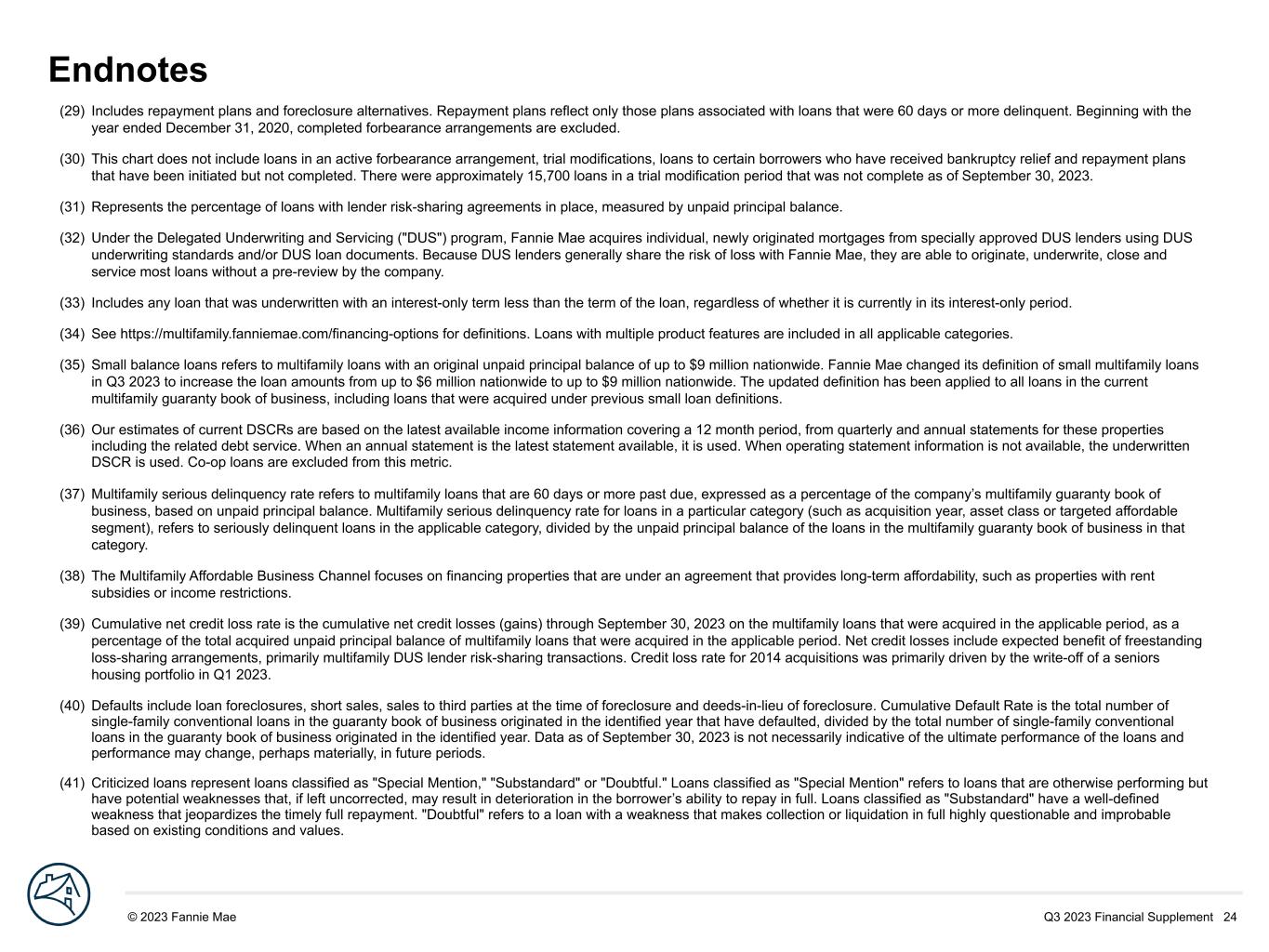 Q3 2023 Financial Supplement 24© 2023 Fannie Mae DRAFT (29) Includes repayment plans and foreclosure alternatives. Repayment plans reflect only those plans associated with loans that were 60 days or more delinquent. Beginning with the year ended December 31, 2020, completed forbearance arrangements are excluded. (30) This chart does not include loans in an active forbearance arrangement, trial modifications, loans to certain borrowers who have received bankruptcy relief and repayment plans that have been initiated but not completed. There were approximately 15,700 loans in a trial modification period that was not complete as of September 30, 2023. (31) Represents the percentage of loans with lender risk-sharing agreements in place, measured by unpaid principal balance. (32) Under the Delegated Underwriting and Servicing ("DUS") program, Fannie Mae acquires individual, newly originated mortgages from specially approved DUS lenders using DUS underwriting standards and/or DUS loan documents. Because DUS lenders generally share the risk of loss with Fannie Mae, they are able to originate, underwrite, close and service most loans without a pre-review by the company. (33) Includes any loan that was underwritten with an interest-only term less than the term of the loan, regardless of whether it is currently in its interest-only period. (34) See https://multifamily.fanniemae.com/financing-options for definitions. Loans with multiple product features are included in all applicable categories. (35) Small balance loans refers to multifamily loans with an original unpaid principal balance of up to $9 million nationwide. Fannie Mae changed its definition of small multifamily loans in Q3 2023 to increase the loan amounts from up to $6 million nationwide to up to $9 million nationwide. The updated definition has been applied to all loans in the current multifamily guaranty book of business, including loans that were acquired under previous small loan definitions. (36) Our estimates of current DSCRs are based on the latest available income information covering a 12 month period, from quarterly and annual statements for these properties including the related debt service. When an annual statement is the latest statement available, it is used. When operating statement information is not available, the underwritten DSCR is used. Co-op loans are excluded from this metric. (37) Multifamily serious delinquency rate refers to multifamily loans that are 60 days or more past due, expressed as a percentage of the company’s multifamily guaranty book of business, based on unpaid principal balance. Multifamily serious delinquency rate for loans in a particular category (such as acquisition year, asset class or targeted affordable segment), refers to seriously delinquent loans in the applicable category, divided by the unpaid principal balance of the loans in the multifamily guaranty book of business in that category. (38) The Multifamily Affordable Business Channel focuses on financing properties that are under an agreement that provides long-term affordability, such as properties with rent subsidies or income restrictions. (39) Cumulative net credit loss rate is the cumulative net credit losses (gains) through September 30, 2023 on the multifamily loans that were acquired in the applicable period, as a percentage of the total acquired unpaid principal balance of multifamily loans that were acquired in the applicable period. Net credit losses include expected benefit of freestanding loss-sharing arrangements, primarily multifamily DUS lender risk-sharing transactions. Credit loss rate for 2014 acquisitions was primarily driven by the write-off of a seniors housing portfolio in Q1 2023. (40) Defaults include loan foreclosures, short sales, sales to third parties at the time of foreclosure and deeds-in-lieu of foreclosure. Cumulative Default Rate is the total number of single-family conventional loans in the guaranty book of business originated in the identified year that have defaulted, divided by the total number of single-family conventional loans in the guaranty book of business originated in the identified year. Data as of September 30, 2023 is not necessarily indicative of the ultimate performance of the loans and performance may change, perhaps materially, in future periods. (41) Criticized loans represent loans classified as "Special Mention," "Substandard" or "Doubtful." Loans classified as "Special Mention" refers to loans that are otherwise performing but have potential weaknesses that, if left uncorrected, may result in deterioration in the borrower’s ability to repay in full. Loans classified as "Substandard" have a well-defined weakness that jeopardizes the timely full repayment. "Doubtful" refers to a loan with a weakness that makes collection or liquidation in full highly questionable and improbable based on existing conditions and values. Endnotes