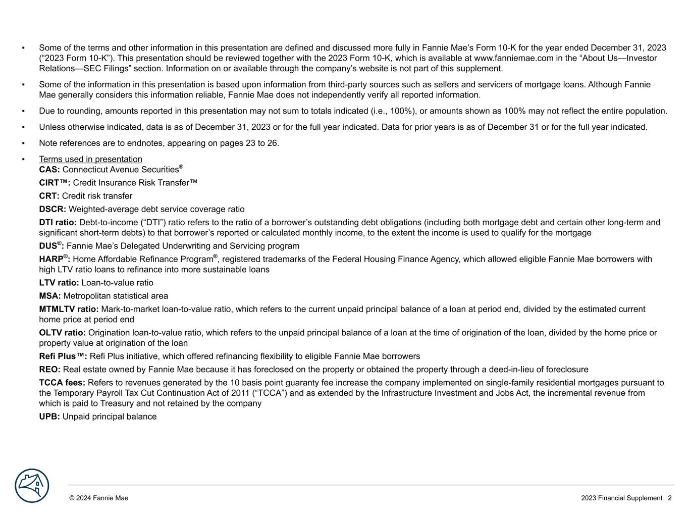 2023 Financial Supplement 2© 2024 Fannie Mae DRAFT ▪ Some of the terms and other information in this presentation are defined and discussed more fully in Fannie Mae’s Form 10-K for the year ended December 31, 2023 (“2023 Form 10-K”). This presentation should be reviewed together with the 2023 Form 10-K, which is available at www.fanniemae.com in the “About Us—Investor Relations—SEC Filings” section. Information on or available through the company’s website is not part of this supplement. ▪ Some of the information in this presentation is based upon information from third-party sources such as sellers and servicers of mortgage loans. Although Fannie Mae generally considers this information reliable, Fannie Mae does not independently verify all reported information. ▪ Due to rounding, amounts reported in this presentation may not sum to totals indicated (i.e., 100%), or amounts shown as 100% may not reflect the entire population. ▪ Unless otherwise indicated, data is as of December 31, 2023 or for the full year indicated. Data for prior years is as of December 31 or for the full year indicated. ▪ Note references are to endnotes, appearing on pages 23 to 26. ▪ Terms used in presentation CAS: Connecticut Avenue Securities® CIRT™: Credit Insurance Risk Transfer™ CRT: Credit risk transfer DSCR: Weighted-average debt service coverage ratio DTI ratio: Debt-to-income (“DTI”) ratio refers to the ratio of a borrower’s outstanding debt obligations (including both mortgage debt and certain other long-term and significant short-term debts) to that borrower’s reported or calculated monthly income, to the extent the income is used to qualify for the mortgage DUS®: Fannie Mae’s Delegated Underwriting and Servicing program HARP®: Home Affordable Refinance Program®, registered trademarks of the Federal Housing Finance Agency, which allowed eligible Fannie Mae borrowers with high LTV ratio loans to refinance into more sustainable loans LTV ratio: Loan-to-value ratio MSA: Metropolitan statistical area MTMLTV ratio: Mark-to-market loan-to-value ratio, which refers to the current unpaid principal balance of a loan at period end, divided by the estimated current home price at period end OLTV ratio: Origination loan-to-value ratio, which refers to the unpaid principal balance of a loan at the time of origination of the loan, divided by the home price or property value at origination of the loan Refi Plus™: Refi Plus initiative, which offered refinancing flexibility to eligible Fannie Mae borrowers REO: Real estate owned by Fannie Mae because it has foreclosed on the property or obtained the property through a deed-in-lieu of foreclosure TCCA fees: Refers to revenues generated by the 10 basis point guaranty fee increase the company implemented on single-family residential mortgages pursuant to the Temporary Payroll Tax Cut Continuation Act of 2011 (“TCCA”) and as extended by the Infrastructure Investment and Jobs Act, the incremental revenue from which is paid to Treasury and not retained by the company UPB: Unpaid principal balance