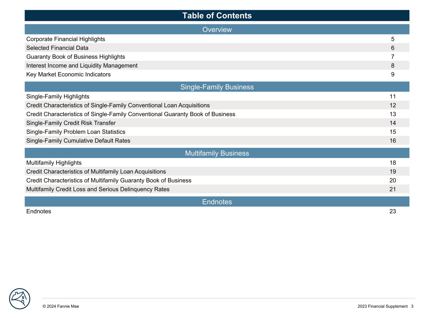 2023 Financial Supplement 3© 2024 Fannie Mae DRAFTTable of Contents Overview Corporate Financial Highlights 5 Selected Financial Data 6 Guaranty Book of Business Highlights 7 Interest Income and Liquidity Management 8 Key Market Economic Indicators 9 Single-Family Business Single-Family Highlights 11 Credit Characteristics of Single-Family Conventional Loan Acquisitions 12 Credit Characteristics of Single-Family Conventional Guaranty Book of Business 13 Single-Family Credit Risk Transfer 14 Single-Family Problem Loan Statistics 15 Single-Family Cumulative Default Rates 16 Multifamily Business Multifamily Highlights 18 Credit Characteristics of Multifamily Loan Acquisitions 19 Credit Characteristics of Multifamily Guaranty Book of Business 20 Multifamily Credit Loss and Serious Delinquency Rates 21 Endnotes Endnotes 23