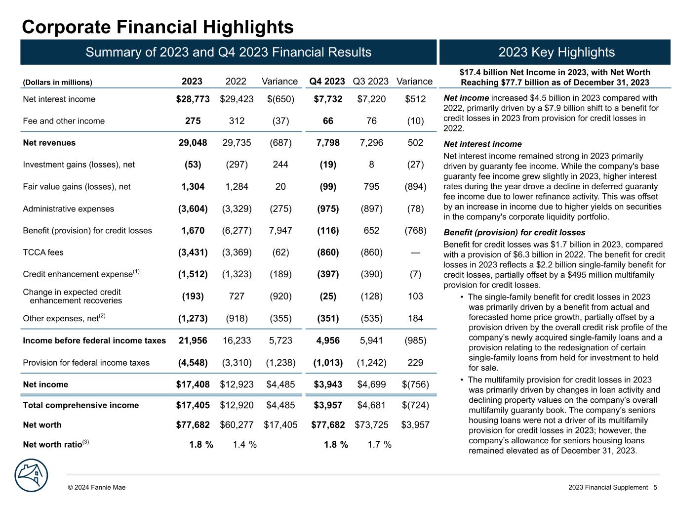 2023 Financial Supplement 5© 2024 Fannie Mae DRAFT Net income increased $4.5 billion in 2023 compared with 2022, primarily driven by a $7.9 billion shift to a benefit for credit losses in 2023 from provision for credit losses in 2022. Net interest income Net interest income remained strong in 2023 primarily driven by guaranty fee income. While the company's base guaranty fee income grew slightly in 2023, higher interest rates during the year drove a decline in deferred guaranty fee income due to lower refinance activity. This was offset by an increase in income due to higher yields on securities in the company's corporate liquidity portfolio. Benefit (provision) for credit losses Benefit for credit losses was $1.7 billion in 2023, compared with a provision of $6.3 billion in 2022. The benefit for credit losses in 2023 reflects a $2.2 billion single-family benefit for credit losses, partially offset by a $495 million multifamily provision for credit losses. • The single-family benefit for credit losses in 2023 was primarily driven by a benefit from actual and forecasted home price growth, partially offset by a provision driven by the overall credit risk profile of the company’s newly acquired single-family loans and a provision relating to the redesignation of certain single-family loans from held for investment to held for sale. • The multifamily provision for credit losses in 2023 was primarily driven by changes in loan activity and declining property values on the company’s overall multifamily guaranty book. The company’s seniors housing loans were not a driver of its multifamily provision for credit losses in 2023; however, the company’s allowance for seniors housing loans remained elevated as of December 31, 2023. Corporate Financial Highlights (Dollars in millions) 2023 2022 Variance Q4 2023 Q3 2023 Variance Net interest income $28,773 $29,423 $(650) $7,732 $7,220 $512 Fee and other income 275 312 (37) 66 76 (10) Net revenues 29,048 29,735 (687) 7,798 7,296 502 Investment gains (losses), net (53) (297) 244 (19) 8 (27) Fair value gains (losses), net 1,304 1,284 20 (99) 795 (894) Administrative expenses (3,604) (3,329) (275) (975) (897) (78) Benefit (provision) for credit losses 1,670 (6,277) 7,947 (116) 652 (768) TCCA fees (3,431) (3,369) (62) (860) (860) — Credit enhancement expense(1) (1,512) (1,323) (189) (397) (390) (7) Change in expected credit enhancement recoveries (193) 727 (920) (25) (128) 103 Other expenses, net(2) (1,273) (918) (355) (351) (535) 184 Income before federal income taxes 21,956 16,233 5,723 4,956 5,941 (985) Provision for federal income taxes (4,548) (3,310) (1,238) (1,013) (1,242) 229 Net income $17,408 $12,923 $4,485 $3,943 $4,699 $(756) Total comprehensive income $17,405 $12,920 $4,485 $3,957 $4,681 $(724) Net worth $77,682 $60,277 $17,405 $77,682 $73,725 $3,957 Net worth ratio(3) 1.8 % 1.4 % 1.8 % 1.7 % Summary of 2023 and Q4 2023 Financial Results 2023 Key Highlights $17.4 billion Net Income in 2023, with Net Worth Reaching $77.7 billion as of December 31, 2023
