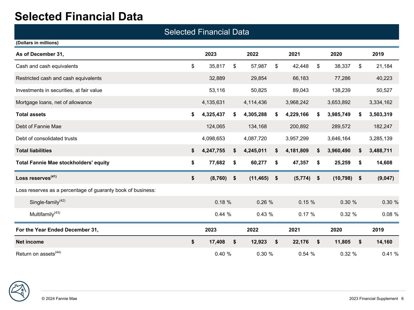 2023 Financial Supplement 6© 2024 Fannie Mae DRAFTSelected Financial Data Selected Financial Data (Dollars in millions) As of December 31, 2023 2022 2021 2020 2019 Cash and cash equivalents $ 35,817 $ 57,987 $ 42,448 $ 38,337 $ 21,184 Restricted cash and cash equivalents 32,889 29,854 66,183 77,286 40,223 Investments in securities, at fair value 53,116 50,825 89,043 138,239 50,527 Mortgage loans, net of allowance 4,135,631 4,114,436 3,968,242 3,653,892 3,334,162 Total assets $ 4,325,437 $ 4,305,288 $ 4,229,166 $ 3,985,749 $ 3,503,319 Debt of Fannie Mae 124,065 134,168 200,892 289,572 182,247 Debt of consolidated trusts 4,098,653 4,087,720 3,957,299 3,646,164 3,285,139 Total liabilities $ 4,247,755 $ 4,245,011 $ 4,181,809 $ 3,960,490 $ 3,488,711 Total Fannie Mae stockholders' equity $ 77,682 $ 60,277 $ 47,357 $ 25,259 $ 14,608 Loss reserves(41) $ (8,760) $ (11,465) $ (5,774) $ (10,798) $ (9,047) Loss reserves as a percentage of guaranty book of business: Single-family(42) 0.18 % 0.26 % 0.15 % 0.30 % 0.30 % Multifamily(43) 0.44 % 0.43 % 0.17 % 0.32 % 0.08 % For the Year Ended December 31, 2023 2022 2021 2020 2019 Net income $ 17,408 $ 12,923 $ 22,176 $ 11,805 $ 14,160 Return on assets(44) 0.40 % 0.30 % 0.54 % 0.32 % 0.41 %