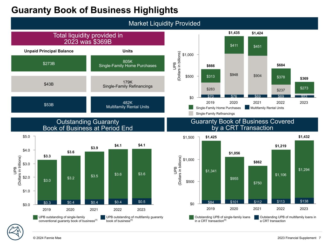 2023 Financial Supplement 7© 2024 Fannie Mae DRAFT U P B (D ol la rs in tr illi on s) $3.3 $3.6 $3.9 $4.1 $4.1 $0.3 $0.4 $0.4 $0.4 $0.5 $3.0 $3.2 $3.5 $3.6 $3.6 2019 2020 2021 2022 2023 $0.0 $1.0 $2.0 $3.0 $4.0 $5.0 Guaranty Book of Business Highlights Outstanding Guaranty Book of Business at Period End Guaranty Book of Business Covered by a CRT Transaction U P B (D ol la rs in b ill io ns ) $70 $76 $69 $69 $53 $283 $948 $904 $237 $313 $411 $451 $378 $273 $666 $1,435 $1,424 $684 $369 2019 2020 2021 2022 2023 $0 $500 $1,000 Single-Family Home Purchases Multifamily Rental Units Single-Family Refinancings Market Liquidity Provided Total liquidity provided in 2023 was $369B Unpaid Principal Balance Units $273B 805K Single-Family Home Purchases $43B 179K Single-Family Refinancings $53B 482K Multifamily Rental Units U P B (D ol la rs in b illi on s) $1,425 $1,056 $862 $1,219 $1,432 $84 $101 $112 $113 $138 $1,341 $955 $750 $1,106 $1,294 2019 2020 2021 2022 2023 $0 $500 $1,000 $1,500 Outstanding UPB of single-family loans in a CRT transaction(6) Outstanding UPB of multifamily loans in a CRT transaction UPB outstanding of single-family conventional guaranty book of business(4) UPB outstanding of multifamily guaranty book of business(5)