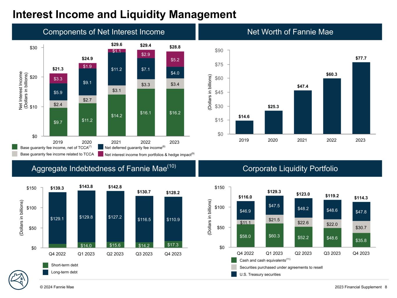 2023 Financial Supplement 8© 2024 Fannie Mae DRAFTInterest Income and Liquidity Management Components of Net Interest Income Net Worth of Fannie Mae Aggregate Indebtedness of Fannie Mae(10) Corporate Liquidity Portfolio N et In te re st In co m e (D ol la rs in b illi on s) $21.3 $24.9 $29.6 $29.4 $28.8 $9.7 $11.2 $14.2 $16.1 $16.2 $2.4 $2.7 $3.1 $3.3 $3.4 $5.9 $9.1 $11.2 $7.1 $4.0 $3.3 $1.9 $1.1 $2.9 $5.2 2019 2020 2021 2022 2023 $0 $10 $20 $30 Base guaranty fee income, net of TCCA(7) Net deferred guaranty fee income(8) Base guaranty fee income related to TCCA Net interest income from portfolios & hedge impact(9) (D ol la rs in b illi on s) $14.0 $15.6 $14.2 $17.3 $129.1 $129.8 $127.2 $116.5 $110.9 $139.3 $143.8 $142.8 $130.7 $128.2 Q4 2022 Q1 2023 Q2 2023 Q3 2023 Q4 2023 $0 $50 $100 $150 (D ol la rs in b illi on s) $58.0 $60.3 $52.2 $48.6 $35.8 $11.1 $21.5 $22.6 $22.0 $30.7 $46.9 $47.5 $48.2 $48.6 $47.8 $116.0 $129.3 $123.0 $119.2 $114.3 Q4 2022 Q1 2023 Q2 2023 Q3 2023 Q4 2023 $0 $50 $100 $150 Cash and cash equivalents(11) Securities purchased under agreements to resell U.S. Treasury securities Short-term debt Long-term debt (D ol la rs in b illi on s) $14.6 $25.3 $47.4 $60.3 $77.7 2019 2020 2021 2022 2023 $0 $15 $30 $45 $60 $75 $90