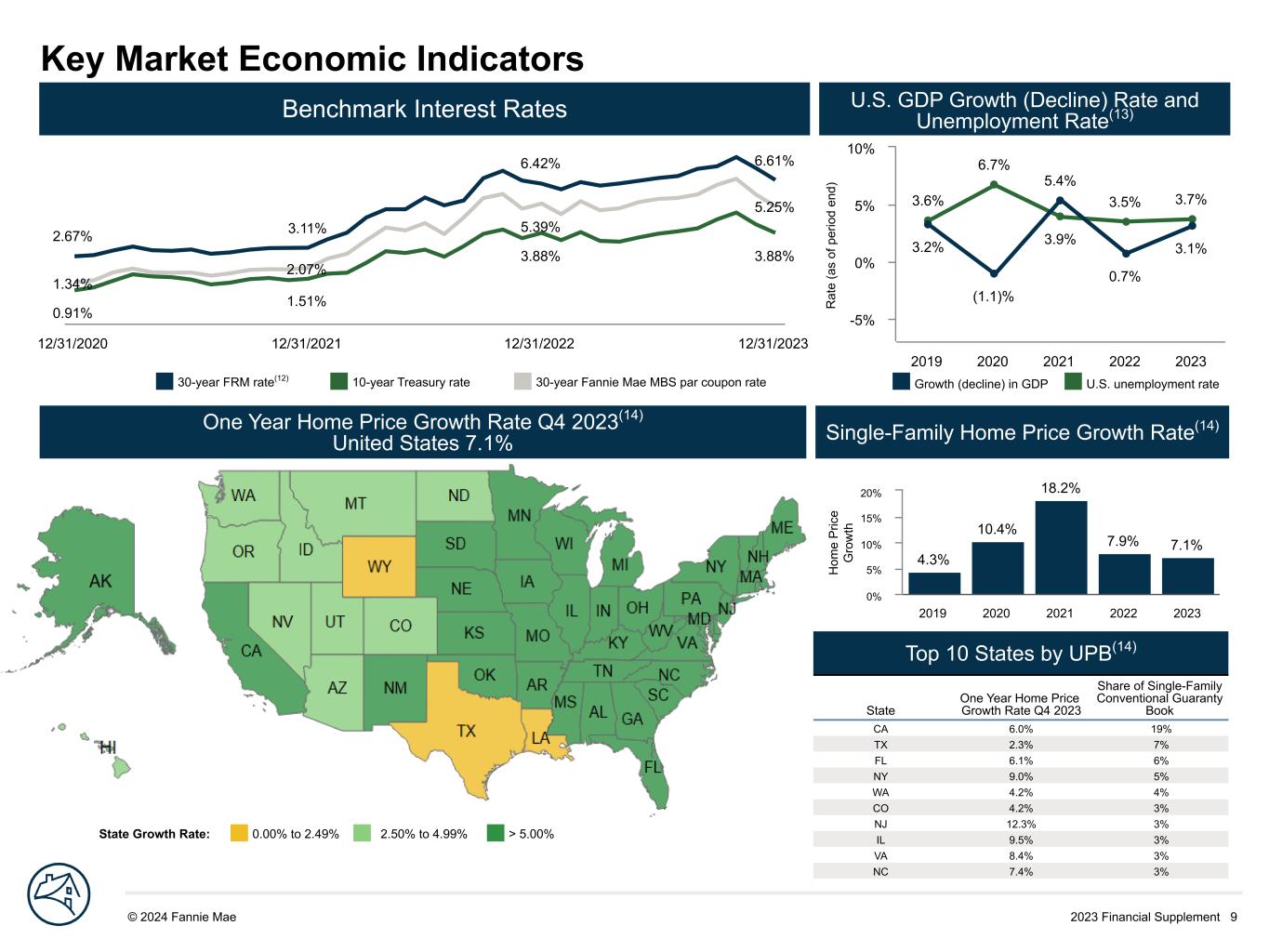 2023 Financial Supplement 9© 2024 Fannie Mae DRAFT R at e (a s of p er io d en d) 3.6% 6.7% 3.9% 3.5% 3.7% 3.2% (1.1)% 5.4% 0.7% 3.1% 2019 2020 2021 2022 2023 -5% 0% 5% 10% Key Market Economic Indicators 0.91% 1.51% 3.88% 3.88% 1.34% 2.07% 5.39% 5.25% 2.67% 3.11% 6.42% 6.61% 12/31/2020 12/31/2021 12/31/2022 12/31/2023 Top 10 States by UPB(14) State One Year Home Price Growth Rate Q4 2023 Share of Single-Family Conventional Guaranty Book CA 6.0% 19% TX 2.3% 7% FL 6.1% 6% NY 9.0% 5% WA 4.2% 4% CO 4.2% 3% NJ 12.3% 3% IL 9.5% 3% VA 8.4% 3% NC 7.4% 3% H om e P ric e G ro w th 4.3% 10.4% 18.2% 7.9% 7.1% 2019 2020 2021 2022 2023 0% 5% 10% 15% 20% Benchmark Interest Rates U.S. GDP Growth (Decline) Rate and Unemployment Rate(13) One Year Home Price Growth Rate Q4 2023(14) United States 7.1% Single-Family Home Price Growth Rate(14) Growth (decline) in GDP U.S. unemployment rate30-year FRM rate(12) 10-year Treasury rate 30-year Fannie Mae MBS par coupon rate State Growth Rate: 0.00% to 2.49% 2.50% to 4.99% > 5.00%
