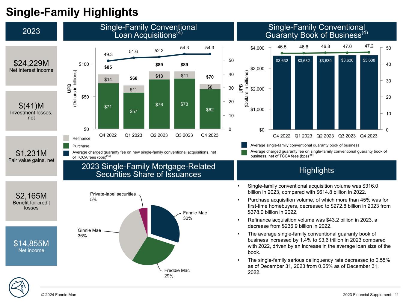 2023 Financial Supplement 11© 2024 Fannie Mae DRAFT Fannie Mae 30% Freddie Mac 29% Ginnie Mae 36% Private-label securities 5% U P B (D ol la rs in b illi on s) $3,632 $3,632 $3,630 $3,636 $3,638 46.5 46.6 46.8 47.0 47.2 Q4 2022 Q1 2023 Q2 2023 Q3 2023 Q4 2023 $0 $1,000 $2,000 $3,000 $4,000 0 10 20 30 40 50 U P B (D ol la rs in b illi on s) $71 $57 $76 $78 $62 $14 $11 $13 $11 $8 49.3 51.6 52.2 54.3 54.3 $85 $68 $89 $89 $70 Q4 2022 Q1 2023 Q2 2023 Q3 2023 Q4 2023 $0 $50 $100 0 10 20 30 40 50 Single-Family Highlights 2023 $24,229M Net interest income $(41)M Investment losses, net $1,231M Fair value gains, net $2,165M Benefit for credit losses $14,855M Net income Single-Family Conventional Loan Acquisitions(4) Single-Family Conventional Guaranty Book of Business(4) 2023 Single-Family Mortgage-Related Securities Share of Issuances Highlights Refinance Purchase Average charged guaranty fee on new single-family conventional acquisitions, net of TCCA fees (bps)(15) Average single-family conventional guaranty book of business Average charged guaranty fee on single-family conventional guaranty book of business, net of TCCA fees (bps)(15) • Single-family conventional acquisition volume was $316.0 billion in 2023, compared with $614.8 billion in 2022. • Purchase acquisition volume, of which more than 45% was for first-time homebuyers, decreased to $272.8 billion in 2023 from $378.0 billion in 2022. • Refinance acquisition volume was $43.2 billion in 2023, a decrease from $236.9 billion in 2022. • The average single-family conventional guaranty book of business increased by 1.4% to $3.6 trillion in 2023 compared with 2022, driven by an increase in the average loan size of the book. • The single-family serious delinquency rate decreased to 0.55% as of December 31, 2023 from 0.65% as of December 31, 2022.