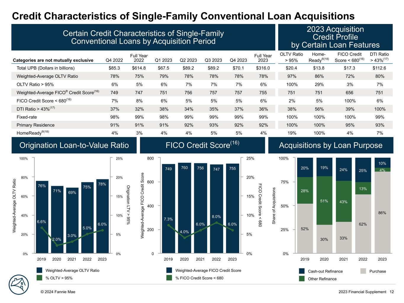 2023 Financial Supplement 12© 2024 Fannie Mae DRAFT S ha re o f A cq ui si tio ns 52% 30% 33% 62% 86% 28% 51% 43% 13% 4%20% 19% 24% 25% 10% 2019 2020 2021 2022 2023 0% 25% 50% 75% 100% W ei gh te d- Av er ag e FI C O C re di t S co re FIC O C redit S core < 680 749 760 756 747 755 7.3% 4.0% 6.0% 8.0% 6.0% 2019 2020 2021 2022 2023 0 200 400 600 800 0% 5% 10% 15% 20% 25% Credit Characteristics of Single-Family Conventional Loan Acquisitions Certain Credit Characteristics of Single-Family Conventional Loans by Acquisition Period 2023 Acquisition Credit Profile by Certain Loan Features Categories are not mutually exclusive Q4 2022 Full Year 2022 Q1 2023 Q2 2023 Q3 2023 Q4 2023 Full Year 2023 OLTV Ratio > 95% Home- Ready®(18) FICO Credit Score < 680(16) DTI Ratio > 43%(17) Total UPB (Dollars in billions) $85.3 $614.8 $67.5 $89.2 $89.2 $70.1 $316.0 $20.4 $13.8 $17.3 $112.6 Weighted-Average OLTV Ratio 78% 75% 79% 78% 78% 78% 78% 97% 86% 72% 80% OLTV Ratio > 95% 6% 5% 6% 7% 7% 7% 6% 100% 29% 3% 7% Weighted-Average FICO® Credit Score(16) 749 747 751 756 757 757 755 751 751 656 751 FICO Credit Score < 680(16) 7% 8% 6% 5% 5% 5% 6% 2% 5% 100% 6% DTI Ratio > 43%(17) 37% 32% 38% 34% 35% 37% 36% 38% 56% 39% 100% Fixed-rate 98% 99% 98% 99% 99% 99% 99% 100% 100% 100% 99% Primary Residence 91% 91% 91% 92% 93% 92% 92% 100% 100% 95% 93% HomeReady®(18) 4% 3% 4% 4% 5% 5% 4% 19% 100% 4% 7% W ei gh te d- Av er ag e O LT V R at io O rigination LTV > 95% 76% 71% 69% 75% 78% 6.6% 2.0% 3.0% 5.0% 6.0% 2019 2020 2021 2022 2023 0% 20% 40% 60% 80% 100% 0% 5% 10% 15% 20% 25% Origination Loan-to-Value Ratio FICO Credit Score(16) Acquisitions by Loan Purpose Weighted-Average OLTV Ratio % OLTV > 95% Weighted-Average FICO Credit Score % FICO Credit Score < 680 Cash-out Refinance Purchase Other Refinance