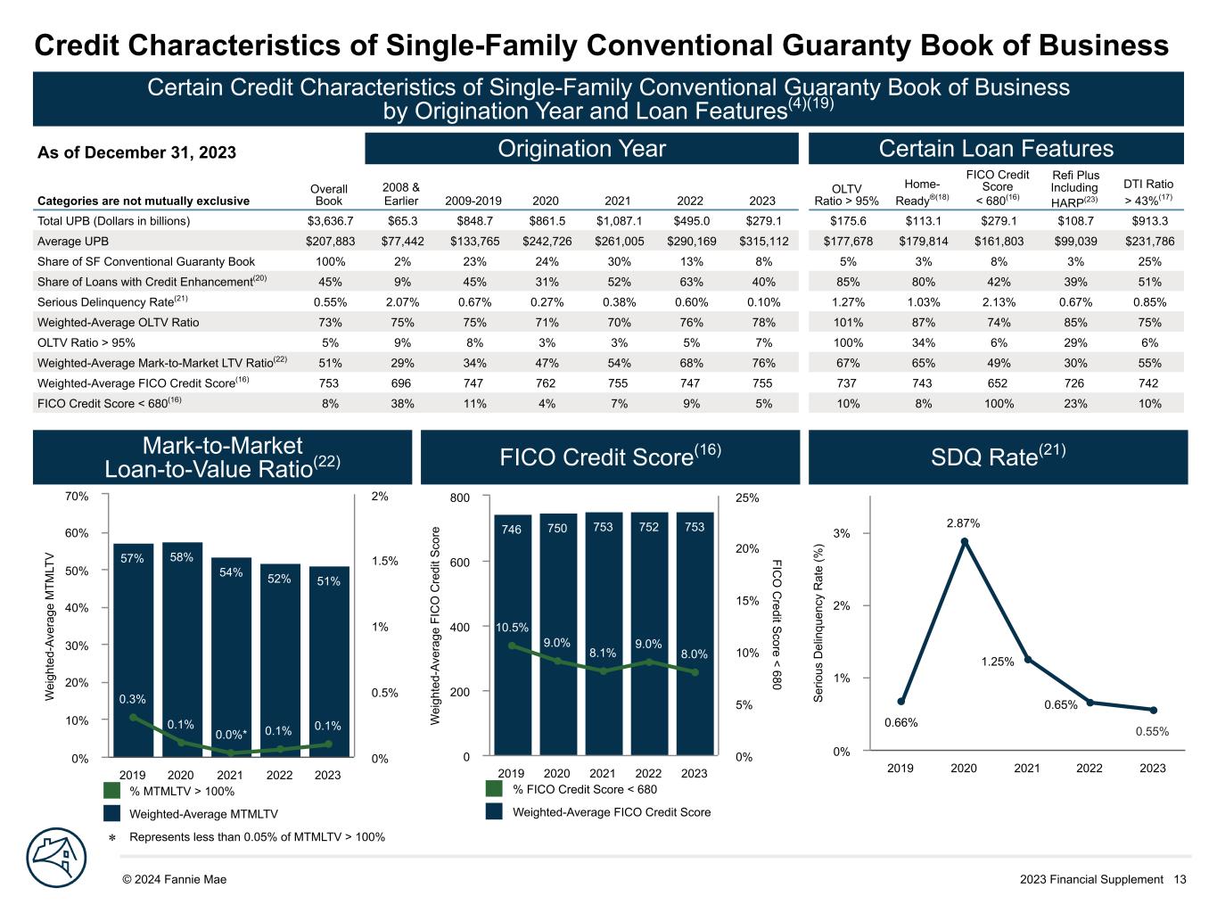 2023 Financial Supplement 13© 2024 Fannie Mae DRAFT S er io us D el in qu en cy R at e (% ) 0.66% 2.87% 1.25% 0.65% 0.55% 2019 2020 2021 2022 2023 0% 1% 2% 3% Certain Credit Characteristics of Single-Family Conventional Guaranty Book of Business by Origination Year and Loan Features(4)(19) As of December 31, 2023 Origination Year Certain Loan Features Categories are not mutually exclusive Overall Book 2008 & Earlier 2009-2019 2020 2021 2022 2023 OLTV Ratio > 95% Home- Ready®(18) FICO Credit Score < 680(16) Refi Plus Including HARP(23) DTI Ratio > 43%(17) Total UPB (Dollars in billions) $3,636.7 $65.3 $848.7 $861.5 $1,087.1 $495.0 $279.1 $175.6 $113.1 $279.1 $108.7 $913.3 Average UPB $207,883 $77,442 $133,765 $242,726 $261,005 $290,169 $315,112 $177,678 $179,814 $161,803 $99,039 $231,786 Share of SF Conventional Guaranty Book 100% 2% 23% 24% 30% 13% 8% 5% 3% 8% 3% 25% Share of Loans with Credit Enhancement(20) 45% 9% 45% 31% 52% 63% 40% 85% 80% 42% 39% 51% Serious Delinquency Rate(21) 0.55% 2.07% 0.67% 0.27% 0.38% 0.60% 0.10% 1.27% 1.03% 2.13% 0.67% 0.85% Weighted-Average OLTV Ratio 73% 75% 75% 71% 70% 76% 78% 101% 87% 74% 85% 75% OLTV Ratio > 95% 5% 9% 8% 3% 3% 5% 7% 100% 34% 6% 29% 6% Weighted-Average Mark-to-Market LTV Ratio(22) 51% 29% 34% 47% 54% 68% 76% 67% 65% 49% 30% 55% Weighted-Average FICO Credit Score(16) 753 696 747 762 755 747 755 737 743 652 726 742 FICO Credit Score < 680(16) 8% 38% 11% 4% 7% 9% 5% 10% 8% 100% 23% 10% Credit Characteristics of Single-Family Conventional Guaranty Book of Business W ei gh te d- Av er ag e FI C O C re di t S co re FIC O C redit S core < 680 746 750 753 752 753 10.5% 9.0% 8.1% 9.0% 8.0% 2019 2020 2021 2022 2023 0 200 400 600 800 0% 5% 10% 15% 20% 25% W ei gh te d- Av er ag e M TM LT V 57% 58% 54% 52% 51% 0.3% 0.1% 0.0%* 0.1% 0.1% 2019 2020 2021 2022 2023 0% 10% 20% 30% 40% 50% 60% 70% 0% 0.5% 1% 1.5% 2% Mark-to-Market Loan-to-Value Ratio(22) FICO Credit Score(16) SDQ Rate(21) % MTMLTV > 100% Weighted-Average MTMLTV * Represents less than 0.05% of MTMLTV > 100% % FICO Credit Score < 680 Weighted-Average FICO Credit Score